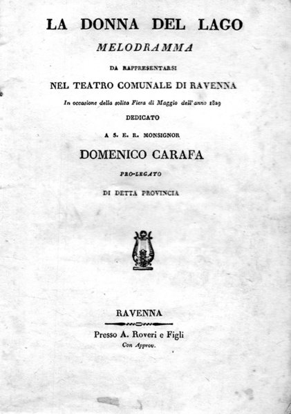 Libretto d’opera. Teatro Comunale di Ravenna, Maggio 1829. Elenco dei personaggi completo dei nomi degli interpreti tra cui Clelia Pastori e Pietro Gentili.