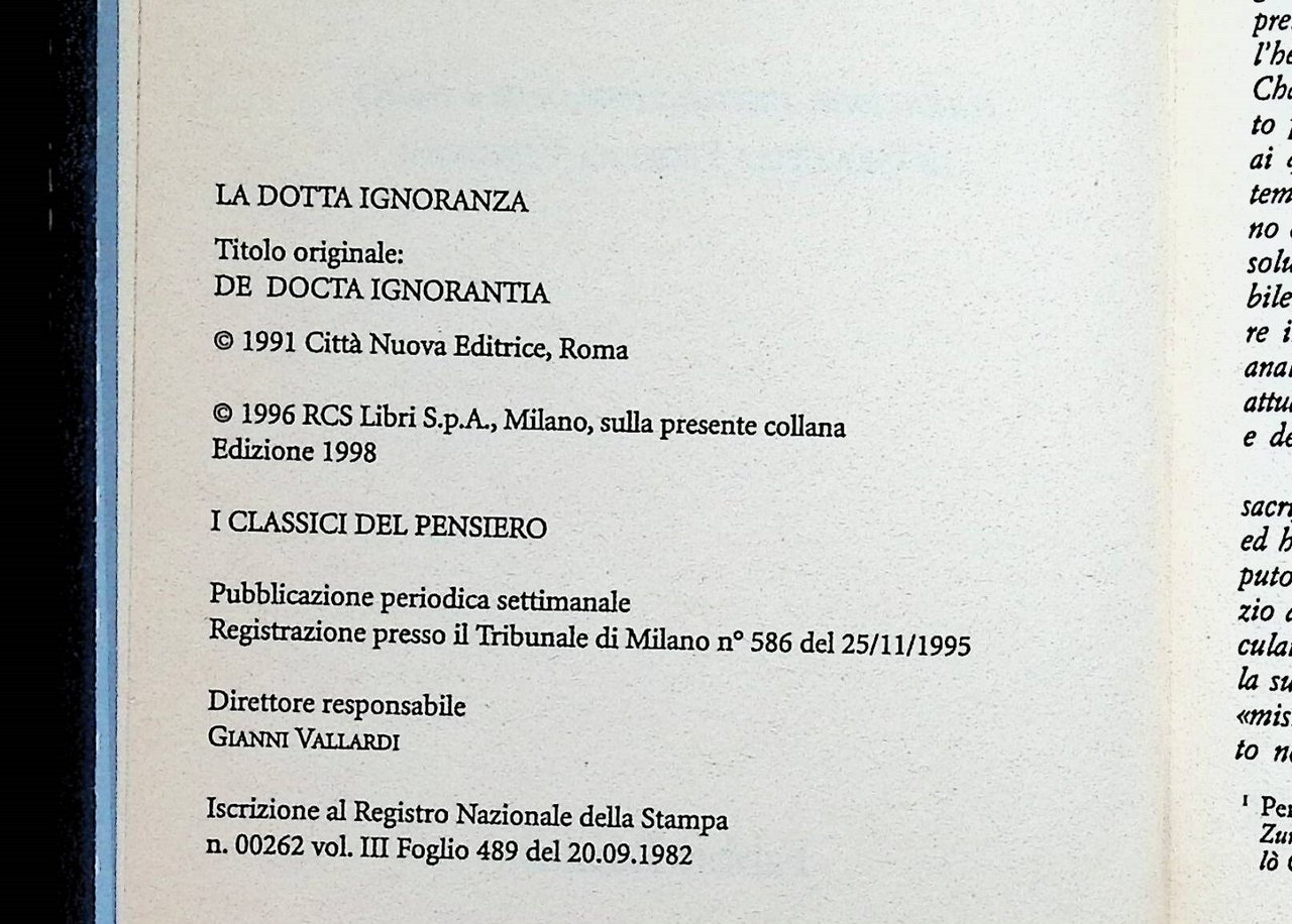 La Dotta Ignoranza. I Classici del Pensiero Fabbri | Libri antichi e moderni | Cusano, Nicola