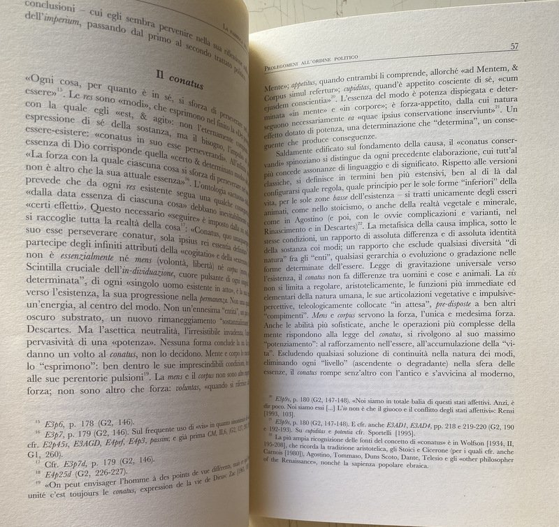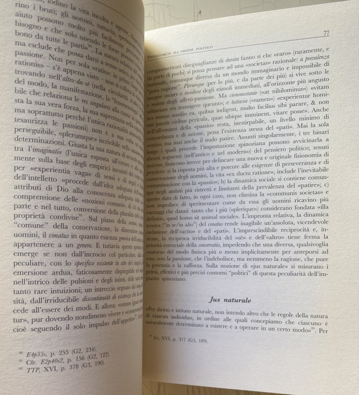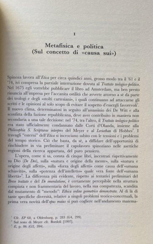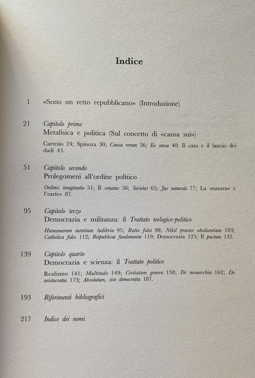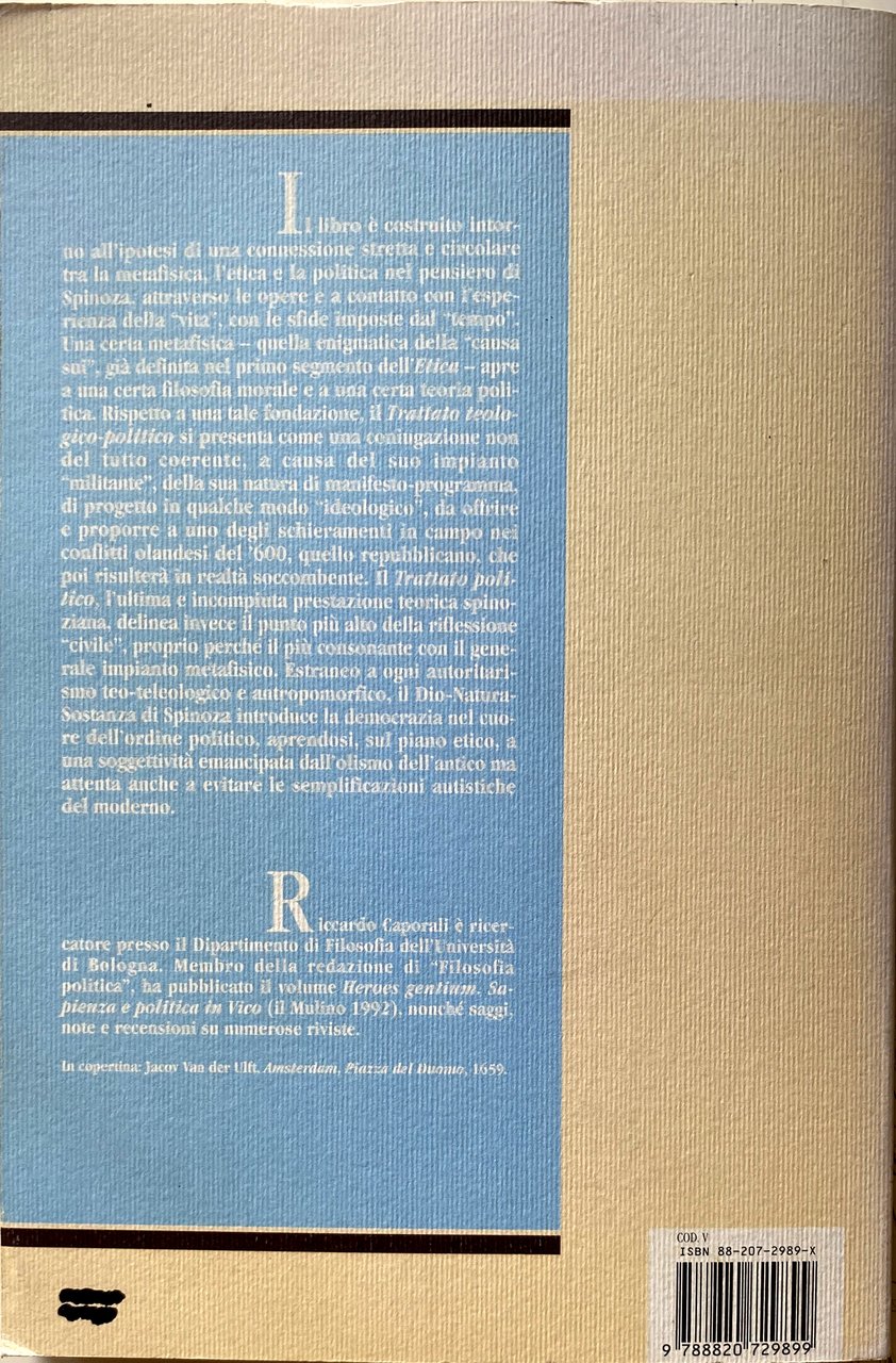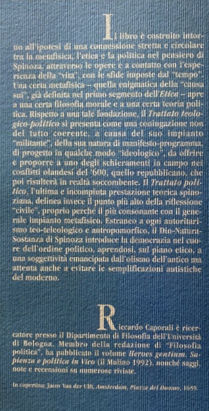 Soggetti: Filosofia, Etica, Politica, Storia, Baruch Spinoza, Illuminismo, Seicento, Scienze sociali, Libri universitari, Umanistica, Metafisica, Cartesio, Causa rerum, Lancio dei dadi, Diritto, Jus naturale, Conatus, Arte, Ratio fidei, Pactum, Repubblica, Democrazia, Militanza, Scienza, De monarchia, De aristocratia, Bibliografia, Riferimento, Saggistica, Libri Vintage fuori catalogo, Trattato politico, Dio, Società, Religione, Fede, Cristianesimo, Cattolicesimo, Sant'Agostino, Aristotele, Etienne Balibar, Jacques Deleuze, Paolo Cristofolini, J. Colerus, P. Bayle, Willem Van Blyenbergh, Remo Bodei, Norberto Bobbio, De Witt, D'Holbac, A. Droetto, M. Gueroult, Dunin-Borkowski, Piero Di Vona, J. Freudenthal, Hegel, Thomas Hobbes, Karl Theodor Jaspers, J. Jelles, Kant, Alexandre Koyré, John Locke, Galileo Galilei, Filippo Mignini, Antonio Negri, Alexandre Matheron, Pierre Macherey, Karl Löwith, Niccolò Machiavelli, L. Meyer, J.J. Rousseau, Carl Schmitt, G. Solari, H. Oldenburg, Marx, Feuerbach, Lucien Mugnier-Pollet, Mosè, Pierre-François Moreau, Meinecke, Platone, Plotino, Tommaso d'Aquino, Leo Strauss, A. Tosel, S. Zac, Arthur Schopenhauer, Bibbia, Esegesi biblica, Razionalismo, XVII secolo, Conversione, Giosuè, Ebraismo, Scomunica, Tractatus theologico-politicus, Empietà, Blasfemia, Chiesa cattolica, Libri proibiti, Condanna, Ethica more geometrico demonstrata, De Deo, Divinità, Definizione, Sostanza, Ateismo, Pensiero spinoziano, Dibattito metafisico, Causa immanente, Creazionismo, Determinismo acosmistico, Libero arbitrio, Stoicismo, Cogito ergo sum, Discorso sul metodo, Esistenza, Prova, Metodo geometrico, Materialità, Fenomenismo, Materialismo, Ragione, Dialogo sui massimi sistemi, Intuizione, Geometria, Mediazione razionale, Intelligibilità, Atto, Essenza, Deus sive Natura, Causalità, Attributi, Critica, Interpretazione, Concezione finalistica, Onnipotenza, Superstizione, Determinismo logico, Riforma, Calvinismo, Tempo, Casa d'Orange-Nassau, Immaginazione, Libertà religiosa, Confessioni, Tolleranza, Laicità, Leviatano, Stato, Amsterdam, Province Unite, Olanda, Paesi Bassi, Convivenza pacifica, Albert Burgh, Islam, Religioni, Impulso, Azione, Potenza, Agire, Akrasìa, Intellectus Emendatione, Tractatus Politicus, Remo Cantoni, Giovanni Gentile, Emilia Giancotti Boscherini, Benedetto, Epistola, Lettere, Giovanni Cristoforo Battelli, Omero Proietti, Spinozismo, Panteismo, Monismo, Necessità, Epistolario, Opere, Philosophy, Ethics, Politics, History, Baruch Spinoza, Enlightenment, Seventeenth century, Social sciences, University books, Humanities, Metaphysics, Descartes, Throwing the dice, Law, Republic, Democracy, Militancy, Science, De monarchia, De aristocratia, Bibliography, Reference, Non-fiction, Books out of print, Political treatise, God, Society, Religion, Faith, Christianity, Catholicism, St. Augustine, Aristotle, Moses, Plato, Plotinus, Thomas Aquinas, Bible, Biblical exegesis, Rationalism, 17th century, Conversion, Joshua, Judaism, Excommunication, Impiety, Blasphemy, Catholic Church, Forbidden Books, Condemnation, Divinity, Definition, Substance, Atheism, Spinoza Thought, Metaphysical Debate, Immanent Cause, Creationism, Acosmistic Determinism, Free Will, Stoicism, Discourse on method, Existence, Proof, Geometric method, Materiality, Phenomenalism, Materialism, Reason, Dialogue on major systems, Intuition, Geometry, Rational mediation, Intelligibility, Act, Essence, Causality, Attributes, Criticism, Interpretation, Finalistic conception, Omnipotence, Superstition, Logical determinism, Reformation, Calvinism, Time, Imagination, Religious freedom, Confessions, Tolerance, Secularism, Leviathan, State, United Provinces, Holland, Netherlands, Peaceful coexistence, Religions, Impulse, Action, Power, Act, Epistle, Letters, Spinozism, Pantheism, Monism, Necessity, Letters, Works, Theology, Teologia