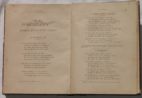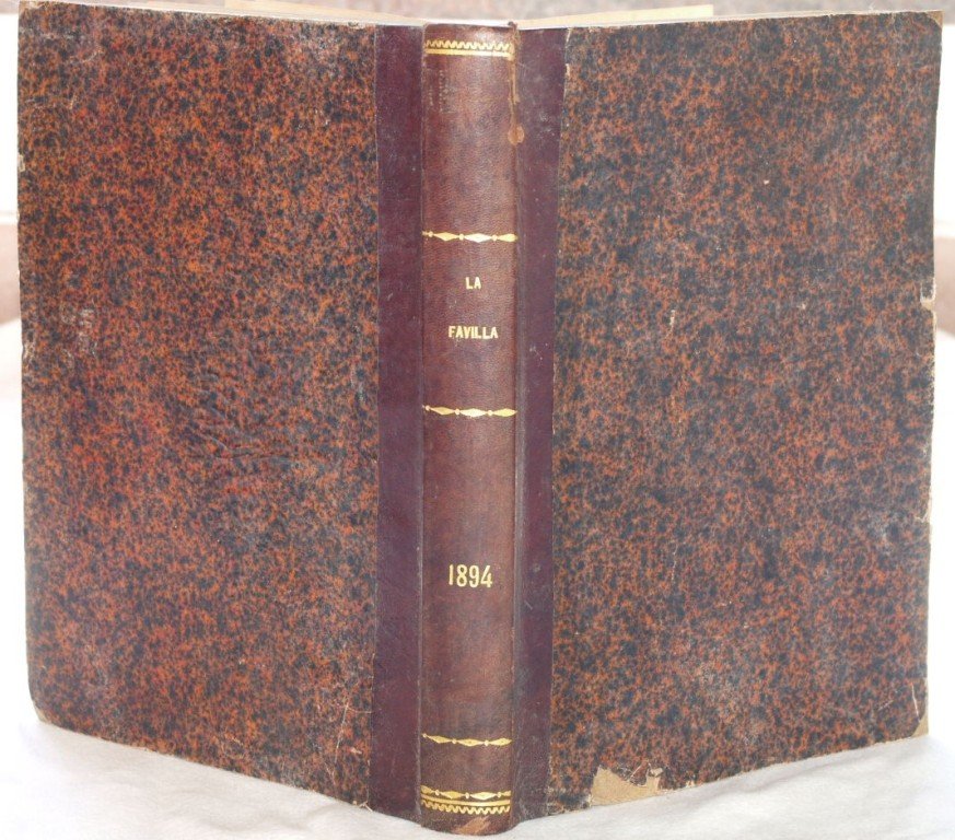 In 8. Dim. 24,5x18 cm. Pp. 368. Rara annata completa del 1894 composta da dodici riviste de La Favilla, rivista di letteratura dell'Umbria. La rivista venne pubblicata dal 1869 al 1910. Qualche pagina dedicata all'attualità di Perugia (la manifestazione internazionale pacifica del 13 Settembre 1894), la lista di alcune pubblicazioni locali. Numerose anche le poesie in dialetto: canti popolari di Città di Castello, poesie in dialetto di Todi. Tra gli articoli presenti: poemi di caccia, Carlo Nodier, Atalanta Baglioni, gita ad Assisi, Eliodoro Lombardi ecc. Legatura in mezza pelle coeva. In buone condizioni. Copertina in mezza pelle coeva con titolo e decorazioni in oro al dorso in buone condizioni generali con lievi usure ai margini e dorso; rottura alla cerniera. Legatura in buone condizioni. All'interno le pagine si presentano in buone condizioni con fioriture. Scarce complete collection of the year 1887 made up of twelve magazines of the La Favilla, magazine of litterature of Umbria. The magazine was published between 1869 and 1910. Some pages are dedicated to the news of Perugia (the pacific international exibition of the 13 of September 1894), the list of some local books. Difefrent poems in umbrian dialects: popular songs of Città di Castello, poems in dialect of Todi. Among the articles in the collection: poems of hunting, Carlo Nodier, Atalanta Baglioni, visit to Assisi, Eliodoro Lombardi etc. Half leather coeval binding. In good conditions. Half leather coeval cover with golden decorations and title in the spine in good general conditions slightly worn in the edges and spine; crack in the spine. Binding in good conditions. Inside pages are in good conditions with foxings.