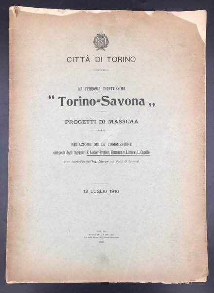 La FERROVIA DIRETTISSIMA "TORINO-SAVONA". Progetti di massima. Relazione della Commissione composta degli Ingegneri E. LOCHER-FREULER, Hermann v. LITTROW, L. CAPELLO (con appendice dell'Ing. LITTROW sul PORTO di SAVONA). 12 luglio 1910.