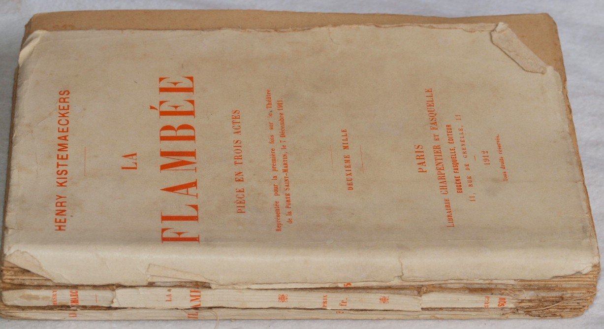 In 8. Dim. 19x12,5 cm. Pp. 257. Edizione francese del 1912 di questa commedia teatrale in tre atti dello scrittore Henry Kistemaeckers. L'opera venne rappresentata per la prima volta a Parigi, al Theatre de la Porte Saint Martin il 7 Dicembre 1911. In discrete condizioni generali. Copertina editoriale in mediocri condizioni generali con usure e parti mancanti ai margini e dorso; piatto anteriore staccato. Legatura in mediocri condizioni con rotture. All'interno le pagine si presentano in buone condizioni con fioriture. French edition of 1912 of this theatral play in three acts by the writer Henry Kistemaeckers. The work was represented for the first time in Paris, in the Theatre de la Porte Saint Martin the 7th December 1911. In fair general conditions. Editorial cover in poor general conditions with wearings and missing parts in the edges and spine; front plate is detached. Binding in poor conditions with cracks. Inside pages are in good conditions with foxings.