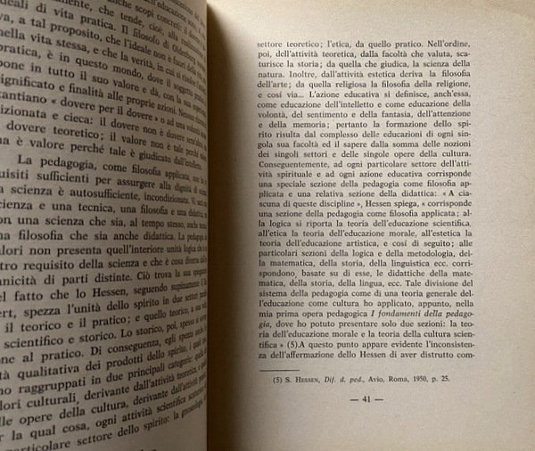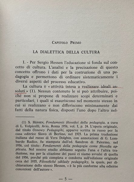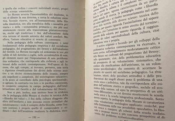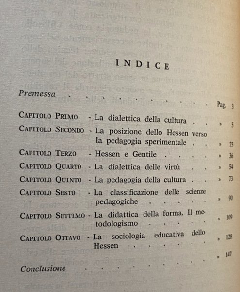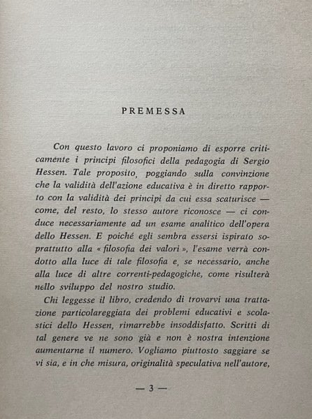 Con questo lavoro ci proponiamo di esporre criticamente i principi filosofici della pedagogia di Sergio Hessen. Tale proposito, poggiando sulla convinzione che la validità dell'azione educativa è in diretto rapporto con la validità dei principi da cui essa scaturisce come, del resto, lo stesso autore riconosce - ci conduce necessariamente ad un esame analitico dell'opera dello Hessen. E poiché egli sembra essersi ispirato soprattutto alla «filosofia dei valori», l'esame verrà con dotto alla luce di tale filosofia e, se necessario, anche alla luce di altre correnti-pedagogiche, come risulterà nello sviluppo del nostro studio.