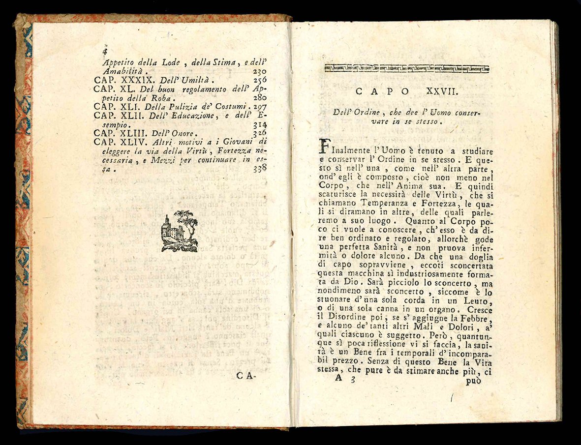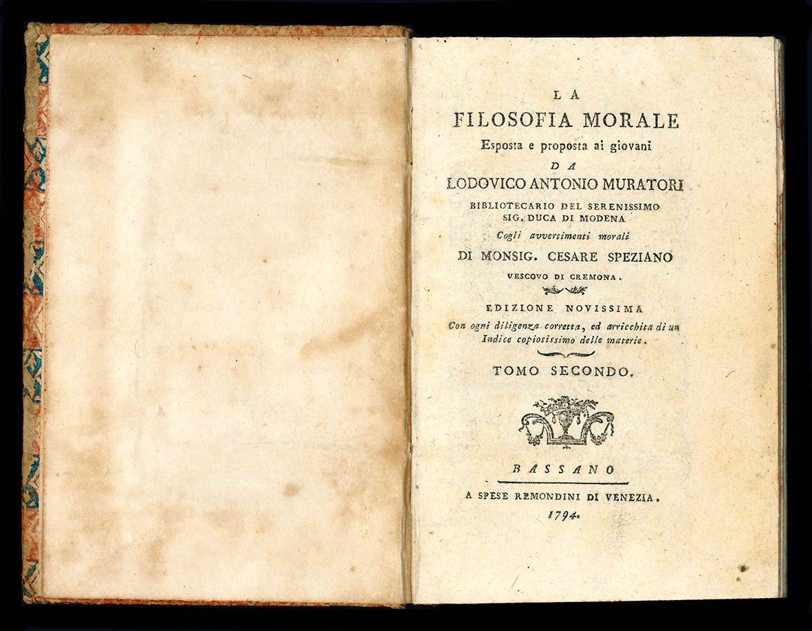 La filosofia morale esposta e proposta ai giovani da Lodovico Antonio Muratori bibliotecario del Serenissimo Sig. Duca di Modena cogli avvertimenti morali di Monsig. Cesare Speziano Vescovo di Cremona. Edizione novissima. Tomo primo (-secondo).