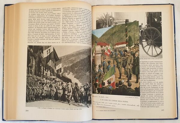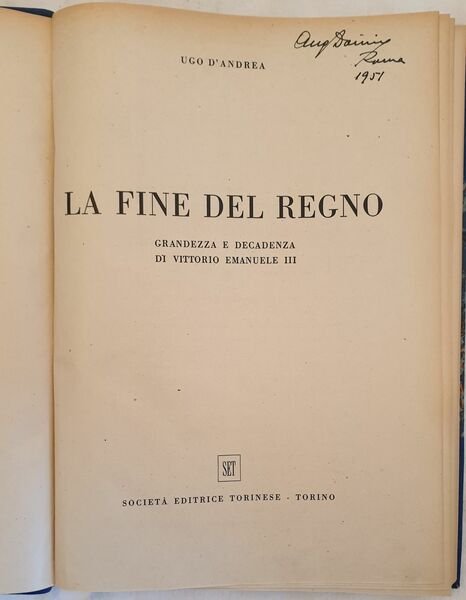 Edizione del 1951 di questa opera su Vittorio Emanuele III di Savoia (1869-1947) scritto da Ugo D'Andrea. Numerose foto in bianco e nero di scene storiche e momenti di vita. All'interno una cartolina de "La domenica del corriere": Il Re giura sul confine della patria. Firma datata 1951 al frontespizio. Ex libris al contropiatto anteriore. In ottime condizioni. Copertina in mezza pelle con titolo e decorazioni in oro al dorso in ottime condizioni generali con lievi usure ai margini e dorso. Legatura in buone condizioni. All'interno le pagine si presentano in ottime condizioni con rare fioriture. In 4. Dim. 30x22 cm. Pp. VIII+440. Edition of 1951 of this work about Vittorio Emanuele III di Savoia (1869-1947) written by Ugo D'Andrea. Different black and white photos of historical scenes and moments of life of Vittorio Emanuele III. Inside a Post card "La domenica del corriere": Il Re giura sul confine della patria. Signature dated 1951 in the title page. Ex libris in the front counterplate. In very good conditions. Half leather coeval cover with golden title and decorations in the spine in very good general conditions lightly worn in the extremities. Binding in good conditions. Inside pages are in very good conditions with occasional foxings. In 4. Dim. 30x22 cm. Pp. VIII+440.