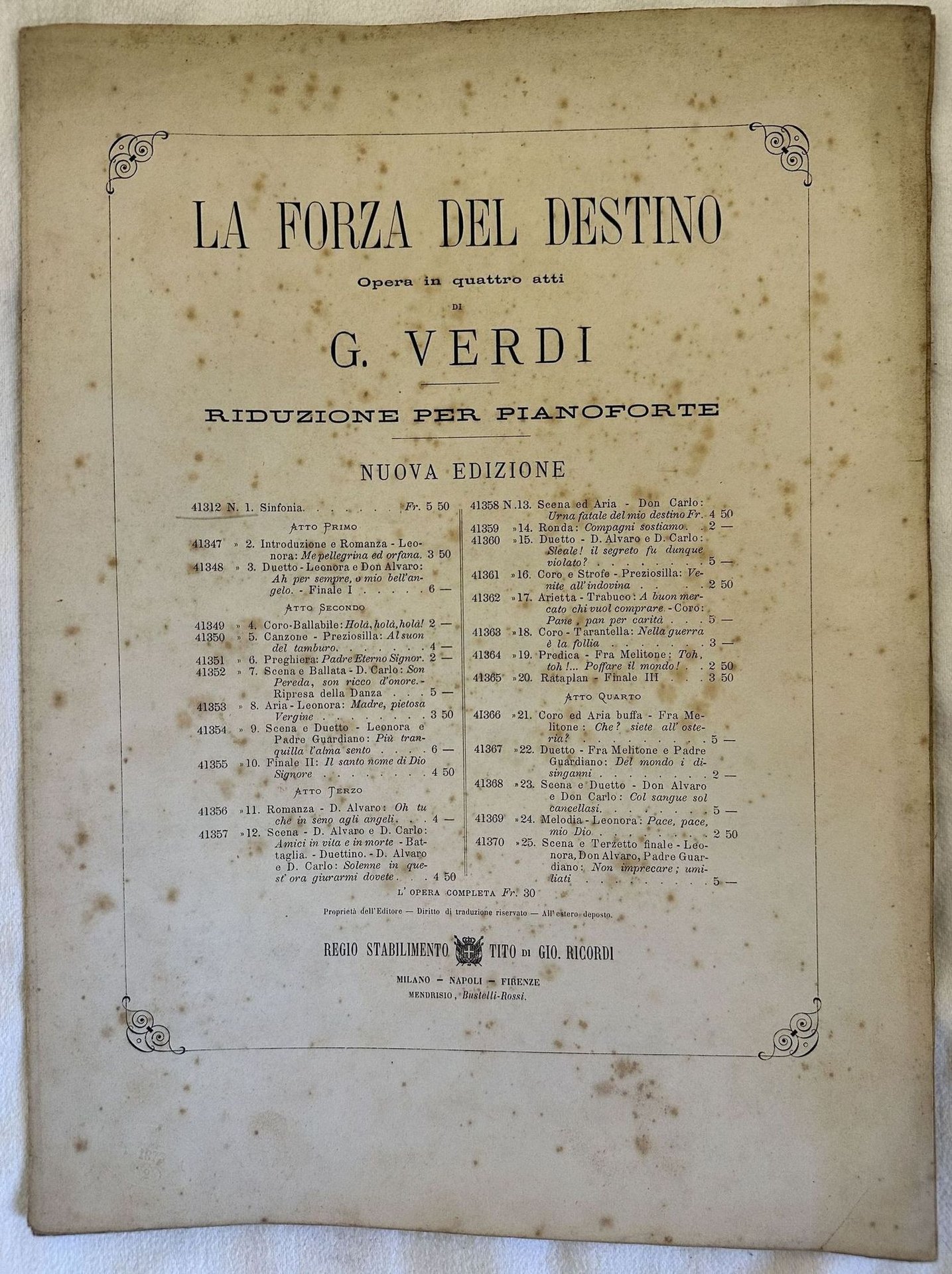 Edizione del febbraio 1873 di questa partitura per pianoforte della melodia "Sinfonia n. 1 tratta dall'opera "La forza del destino" di Giuseppe Verdi. In buone condizioni. Copertina editoriale in buone condizioni generali con lievi usure ai margini e dorso. Legatura assente. Pagine in buone condizioni con fioriture. In folio. cm. 35x26. Pp. 12.Edition of febraury 1873 of this score for piano of the melody "Sinfonia n. 1 from the work "La forza del destino" by Giuseppe Verdi. In good conditions. Editorial cover in good conditions lightly worn in the spine. Binding is missing. Pages in good conditions with foxing. In folio. cm. 35x26. Pp. 12.