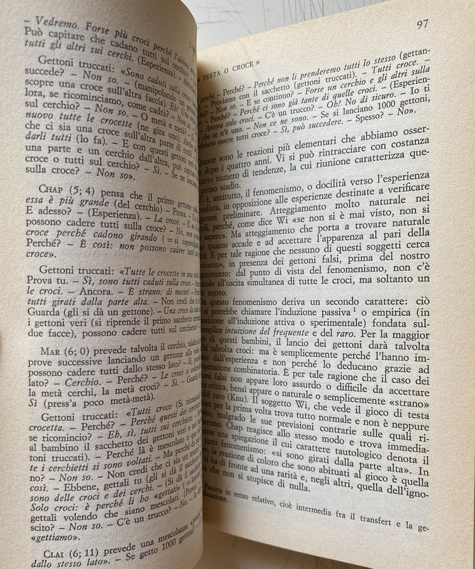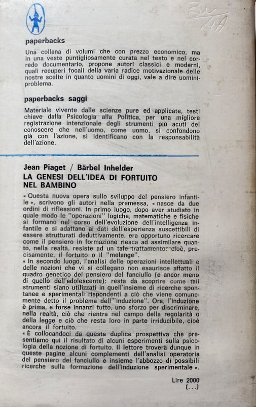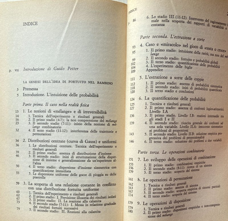 Soggetti: Psicologia sociale, Scienze sociali, Induzione, Pedagogia, Infanzia, Bambini, Sviluppo psichico, Pensiero infantile, Intelligenza, Creatività, Esperienza, Fortuito, La naissance de l'intelligence chez l'enfant, Intuizione, Probabilità, Adulti, Meccanismi, Fasi, 4 anni, Adolescenza, Crescita, Mescolanza, Irreversibilità, Reazioni, Età diverse, Tiro a sorte, Miracoli, Combinazioni, Permutazioni, Arrangiamenti, Relazioni, Adattamento, Operazioni combinatorie, Numeri, Filosofia contemporanea, Previsione, Prevedere, Calcolo, Elementi, Disegno, Disegni, Scoperta, Curiosità, Cervello, Scatole bianche, Peso, Misure, Spazio, Domande, Comprensione, Magneti, La génesis del número en el niño, Conception, The Origin of the Idea of Chance in Children, Destino, Pallone, Esperimenti, Croce, Colori, Ragionamento induttivo, Simmetria, Distribuzione, Traiettorie, Proporzionalità, Quantificazione, Coppie, Caso, Scatola, Logica, Posizione, Educazione, Formazione, Genetica, Genitori, Ambiente sociale, Scuola, Tempo, Età evolutiva, Lev Semënovic Vygotskij, Anni Cinquanta, Anni Sessanta, Anni Settanta, Casualità fisica, Ricerche, Parola, Giudizio morale, Eventi fisici, Rappresentazione, Mondo, Fanciullo, Realismo, Animismo, Finalismo, Oggetto, Intenzionalità, Partecipazione, Coscienza, Durata, Risultato, Velocità, Spostamento, Nozioni, Alina Szeminska, Futuro, Ansia, Decisione, Lancio, Pendolo, Regressione, Sfortuna, Fortuna, Personalità, Emozioni, Mélange, Evoluzione, Azzardo, Gettoni truccati, Lato, Transfert, Cerchio, Lato, Abilità, Capacità, Stadio, Eventualità, Reazione, Calamita, Osservazione, Derb, Flum, Dadi, Prove, Lanci, Illusione, Soluzione empirica, Biglie, Epistemologia, Stadio senso-motorio, Assimilazione, Equilibrio fluttuante, Omeostasi, Sviluppo cognitivo, Pierre Bovet, Albert Châtelet, Jean Dieudonné, André Lichnerowicz, Gustave Choquet, Caleb Gattegno, Bottoni, Biglie, Critica, Collezionismo, Libri Vintage fuori catalogo, Bibliografia, Riferimento, Classici, Conservazione, Psicologi svizzeri, Social psychology, Social sciences, Induction, Pedagogy, Infancy, Children, Psychic development, Infant thinking, Intelligence, Creativity, Experience, Fortuitous, Intuition, Probability, Adults, Mechanisms, Phases, 4 years, Adolescence, Growth, Mixture, Irreversibility, Reactions, Different ages, Draw lots, Miracles, Combinations, Permutations, Arrangements, Relationships, Adaptation, Combinatorial operations, Numbers, Contemporary philosophy, Prediction, Predict, Calculation, Elements, Drawing, Drawings, Discovery, Curiosity, Brain, White boxes, Weight, Measurements, Space, Questions, Understanding, Magnets, Destiny, Balloon, Experiments, Tests, Cross, Colors, Inductive Reasoning, Symmetry, Distribution, Trajectories, Proportionality, Quantification, Pairs, Case, Box, Logic, Position, Education, Training, Genetics, Parents, Social environment, School, Time, Developmental age, Fifties, Sixties, Seventies, Physical randomness, Researches, Word, Moral judgement, Physical events, Representation, World, Child, Realism, Animism, Finalism, Object, Intention, Participation, Consciousness, Duration, Result, Speed, Movement, Notions, Future, Anxiety, Decision, Toss, Pendulum, Regression, Bad Luck, Luck, Personality, Emotions, Evolution, Gambling, Stacked Coins, Side, Circle, Side, Ability, Stage, Contingency, Magnet, Observation, Dice, Throws, Illusion, Empirical solution, Marbles, Epistemology, Sensory-motor stage, Assimilation, Fluctuating equilibrium, Homeostasis, Cognitive development, Marbles, Criticism, Collecting, Out-of-print books, Bibliography, References, Classics, Conservation, Swiss Psychologists