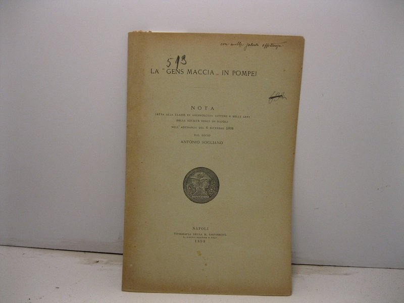 In 8, pp. 8. Intonso. Br. ed. Studio relativo alla 'gens Maccia', nome che compare nell'epigrafia pompeiana, e che aiuta a far luce nella dibattuta questione sul nome del commediografo latino Plauto Maccio.