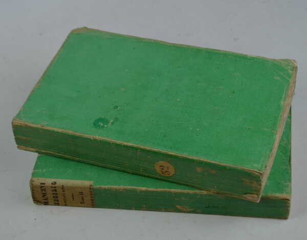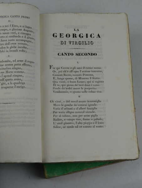 Quattro parti in due volumi di cm. 24, pp. xii, 202 (2) 325 (3); 371 (1), 64 + (2) d'errata. Legatura coeva d'attesa in carta verde. Esemplare genuino, marginoso e ben conservato. Edizione in tiratura limitata di soli 150 esemplari numerati progressivamente a macchina (ns. n. 32). La parte finale del secondo volume titola: "Ad Annibal Caro dedica del presente voglarizzatore dell'Eneide".