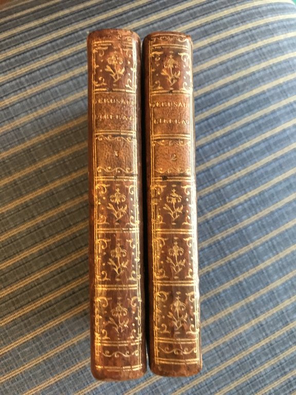 Due volumi in 24mo (cm. 11,6). Pp. occhietto, frontespizio, XII, 249, [1], 1 tav. fuori testo con ritratto dell'autore inciso dal Marillier all'antiporta ; occhietto, frontespizio, 253, [1]. Frontespizi con piccola vignetta xilografica. Legatura coeva in piena pelle Dorso con doppio tassello e fregi in oro. Piatti incorniciati da triplo filetto in oro. Dentelles dorate e filetto in oro sul bordo dei piatti, risguardi in carta decorata a mano.Tagli dorati. Minimi difetti agli angoli e bordi dei piatti, ma esemplare molto buono.