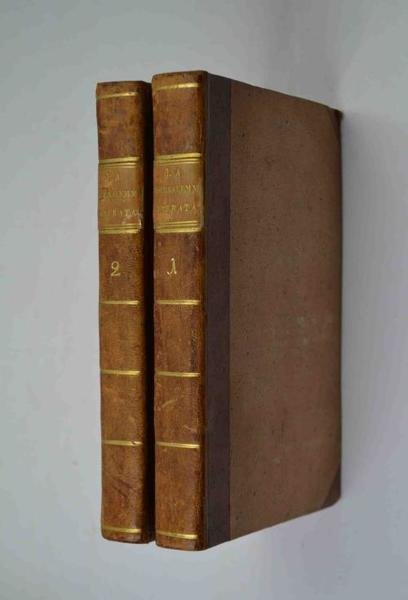 Due volumi di cm. 19,5, pp. (4) viii, 326; (4) 333 (3). Legatura coeva in mezza pelle con punte, dorsi lisci con titoli e filetti in oro. Esemplare genuino e ben conservato. Nitida ed elegante edizione di cui apparve anche la tiratura con le tavole.