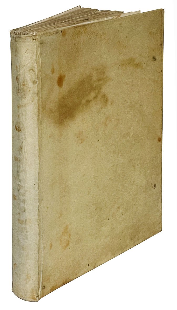 In 4to (mm 196x148); pp. [8], 190, [2]. Segnatura: π⁴ A-M⁸. Manca l'ultima carta (M8), bianca. Occhietto e stemma xilografico del dedicatario al frontespizio. Firma abrasa e nota manoscritta all'occhietto, nota manoscritta al verso della stessa carta. Frontespizio macchiato. Carta leggermente ed uniformemente brunita, lievi aloni e piccoli restauri marginali. Restauro all'occhietto e al margine interno della c. A1. Pergamena rigida moderna con aloni e piccole macchie ai piatti.