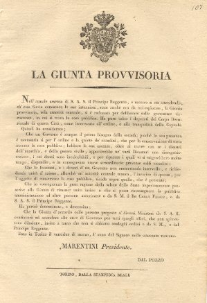 La giunta Provvisoria si è radunata per deliberare sulle gravissime circostanze in cui si trova la cosa pubblica. La Giunta è d'accordo nel continuare ad attendere alle cure di Governo per tutti quegli affari, che non ammettono dilazione, insino a tanto che non si abbiano analoghi ordini o da S. M. o dal Principe Reggente. 22 marzo 1822.