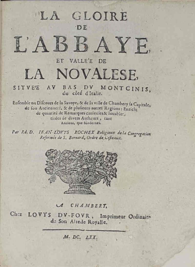 >in-4 (mm. 220x172), ff. 8 n.n., pp. 150, (2), 78, (6); 2 ff. n.n. tra le pp. 124 e 125: "Remarque sur la vie de S. Eldra" ed errata relativa alle pp. 90-150; leg. m. pelle e angoli, tit. oro su tassello e fregi al dorso. Importante storia dell'Abbazia, dall'inizio dell'era Cristiana sino all'XVII secolo, s'inizia con una descrizione della catena delle Alpi, e in seguito tratta dei popoli che abitarono l'Alta Valle di Susa e la Valle di Chambéry, dei personaggi importanti che vi dimorarono, da Cesare in avanti, e dai Santi e Monaci che la diressero. Di grande importanza per la storia religiosa e civile valsusina e sabauda. Buon esemplare nonostante alcuni piccoli restauri ai margini esterni bianchi di alcuni fogli all'inizio del volume, per il resto ben conservato.