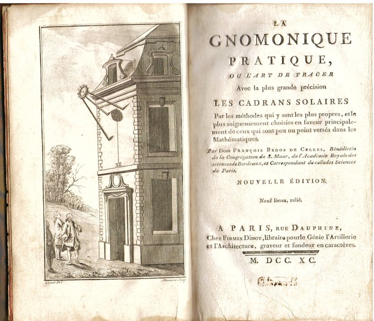 In-8° (210x125mm), pp. XL, 510, legatura coeva p. pelle marmorizzata con titolo in oro su tassello, filetti e decori floreali in oro su dorso a nervetti. Tagli rossi, sguardie marmorizzate. Antiporta figurata incisa su rame, 38 tavv. calcografiche ripiegate in fine incise da de la Gardette, Meunier, ecc., da invenzione di Maniere, Monniotte, ecc. Tabelle alle pp. 429-477. Qualche goretta e brunitura lieve. Bell'esemplare. Reimpressione (l'edizione originale risale al 1760) di questo rilevante trattato settecentesco di gnomonica. Indice: 1.Notions preliminaires; 2.Instrumens necessaires a' la construction des cadrans solaires; 3.Explication des calculs dont on se servira dans ce traite de gnomonique; 4.Cadran horisontal; 5.Des cadrans qu'on appelle reguliers; 6.Cadrans verticaux declinans; 7.Cadrans verticaux sans centre; 8.Cadrans inclines; 9.Meridiennes; 10.Cadrans portatifs; 11.Observations sur la maniere de regler les horologes; 12.Principaux usages ducompas de proportion concernant la gnomonique; 13.Devises pour les cadrans solaires. Al termine: 'Extrait des registres de l'Academie Royale des Sciences'. 'La Gnomonique Pratique de Don Bedos de Celles mérite une distinction particulière. On y trouve la théorie et la pratique réunies avec le plus grand soin' (Montucla). François Lamathe Bedos de Celles de Salelles, detto Dom Bedos de Celles (Caux, 1709-Abbazia di Saint Denis, 1779) fu monaco benedettino della Congregazione di Saint Maur, organista e a sua volta valente costruttore d'organi, nonché autore di un importantissimo trattato sulla costruzione degli organi, L'Art du Facteur d'Orgues, monumentale summa delle conoscenze di cui si disponeva in materia nel corso del XVIII secolo e tuttora imprescindibile strumento di studio. Brunet, Table, 8389.