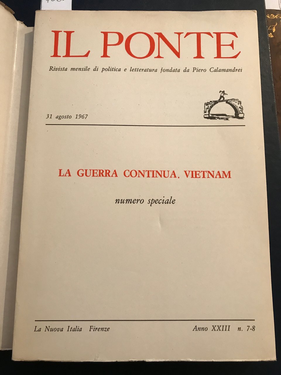 In-8°, pp. 829 - 1046, brossura editoriale con sovraccop. fig. a colori Numero doppio 7-8 anno XXIII, Il Ponte. Rivista mensile di politica e letteratura fondata da Piero Calamandrei. 31 agosto 1967