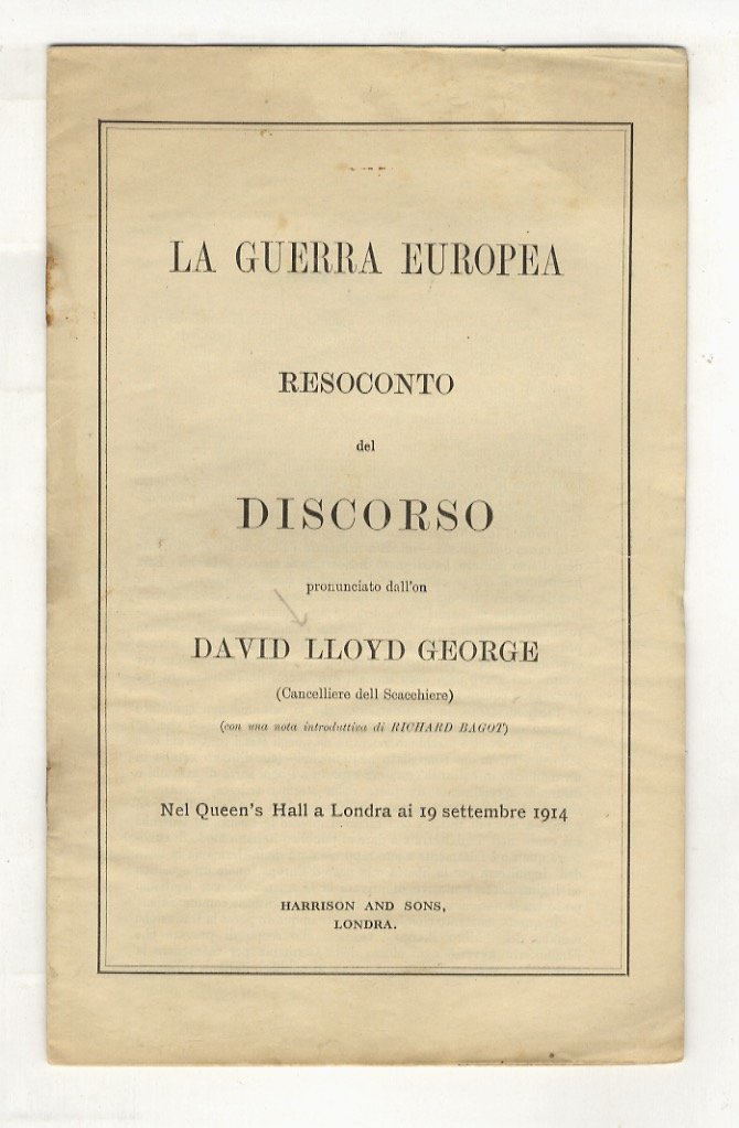 La Guerra Europea. Resoconto del discorso pronunciato (.) nel Queen's Hall a Londra il 19 settembre 1914. Con una nota introduttiva di Richard Bagot.