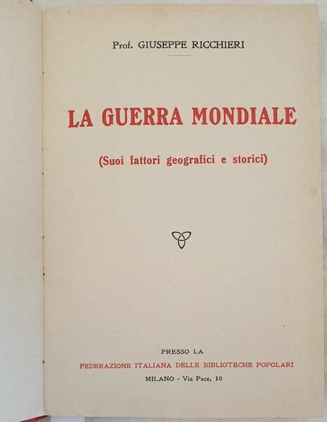 Edizione del 1915 di questa monografia sulla guerra mondiale del Prof. Giuseppe Ricchieri.<BR><BR>All'inizio mappa a colori ripiegata dell'Europa politica e Stati e possedimenti.<BR><BR>Alcune mappe e foto in bianco e nero.<BR><BR>All'interno: ampiezza e cause fondamentali dell'attuale configurazione, Caratteristiche dell'espansione coloniale della SPagna e del Portogallo, Olanda, Gran Bretagna e Francia, Russia e Stati Scandinavi, Turchia, La Germania sua eespansione commerciale e coloniale, Belgio, Sttai Uniti e Giappone, Il principio di nazionalità, Le principali questioni nazionali della guerra attuale, L'Italia di fronte alla guerra attuale ecc.<BR><BR>In buone condizioni.<BR><BR>Coperta editoriale in buone condizioni generali con lievi usure ai margini e dorso. Legatura in buone condizioni. Pagine in buone condizioni con rare fioriture. In 16. Dim. 16x11,5 cm. Pp. 177+XI+(2). Edition of 1915 of this monography about the world war by Prof. Giuseppe Ricchieri. At the beginning folded coloured map of politic Europe and States and colonies. Some maps and black and white photos. In good conditions. Editorial cover in good conditions lightly worn in the extremities. Binding in good conditions. Pages in good conditions with occasional foxings. In 16. Dim. 16x11,5 cm. Pp. 177+XI+(2).