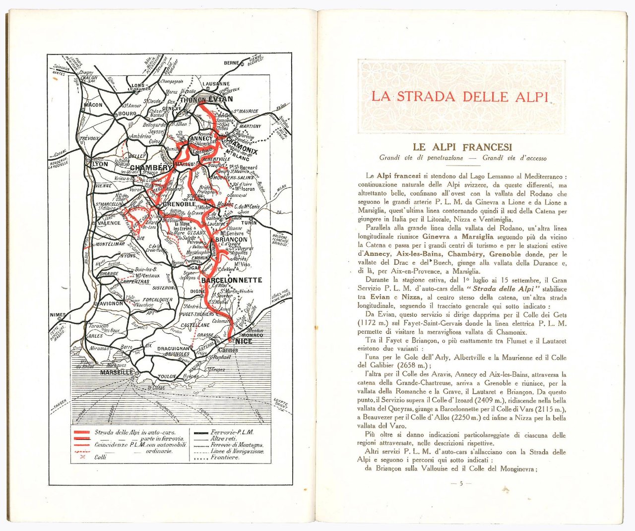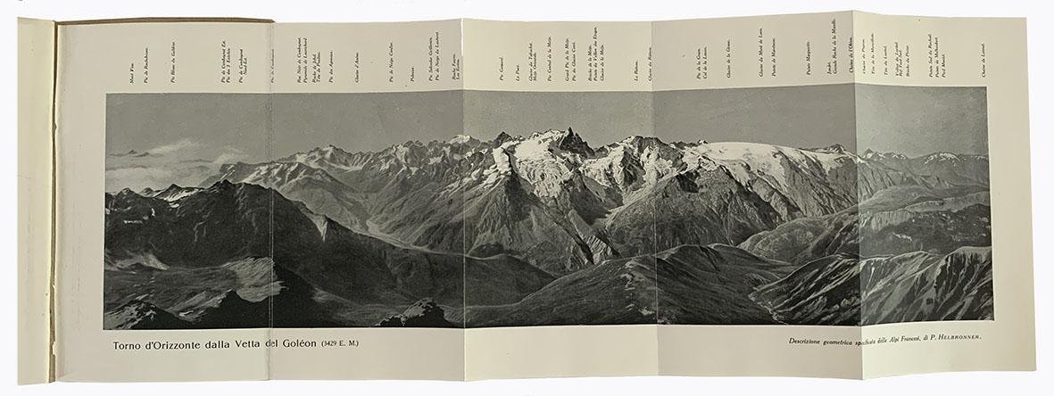 In 16mo (mm 200x120);pp. 33, [3], 1 c.di tav. Edizione a cura delle Ferrovie Paris - Lyon - Mediterranée (P.L.M.). Frontespizio con illustrazione. Trentaquattro illustrazioni nel testo, nove cartine geografiche a colori, grande cartina panoramica delle Alpi più volte ripiegata fuori testo. Carta patinata. Brossura editoriale illustrata con impressioni in oro e verde ai due piatti.