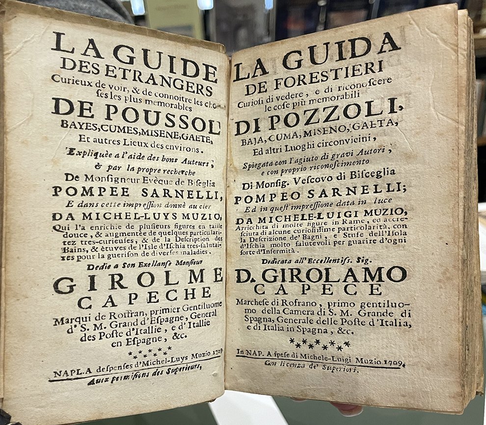 (Ediz. Bilingue-Pozzuoli-Gaeta-Fig. ’700) SARNELLI Pompeo. La guide des entrangers curieux de voir, La guida de’ forestieri Curiosi di vedere e di riconoscere le cose più memorabili di Pozzuoli, Baia, Cuma, Miseno, Gaeta ed altri Luoghi circonvicini, Spiegata con l’aiuto di bravi Autori... Arricchita di molte figure in Rame .., con la descrizione de’ Bagni, e Stufe dell’Isola d’Ischia... Napoli, 1709. In-16°, leg. coeva t. perg., con tit. al d.; doppio front.; pp. (12)-192+192 (di testo a fronte francese) con antip. inc. e 34 belle tavole di vedute e monumenti, incise in rame f.t. compr. la grande carta di Pozzuoli ripiegata. Ottimo esemplare