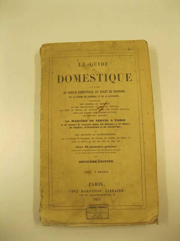 In 16, pp. 240 con 10 tavole in lit.  piu' volte ripiegate. Brossura editoriale con qualche segno d'uso. Manuale poco comune in seconda edizione contenente tutte le istruzuioni per un maggiordomo, sia in casa borghese che in case piu' grandi. Dalla pulizia degli abiti, l'accensione delle lambade, la spesa al mercato, la gestione della cucina e della cantina.  Le tavole fuori testo illustrano la mis en place per cene e pranzi di varia natura e occasione. Vicaire, coll. 430 - 431.