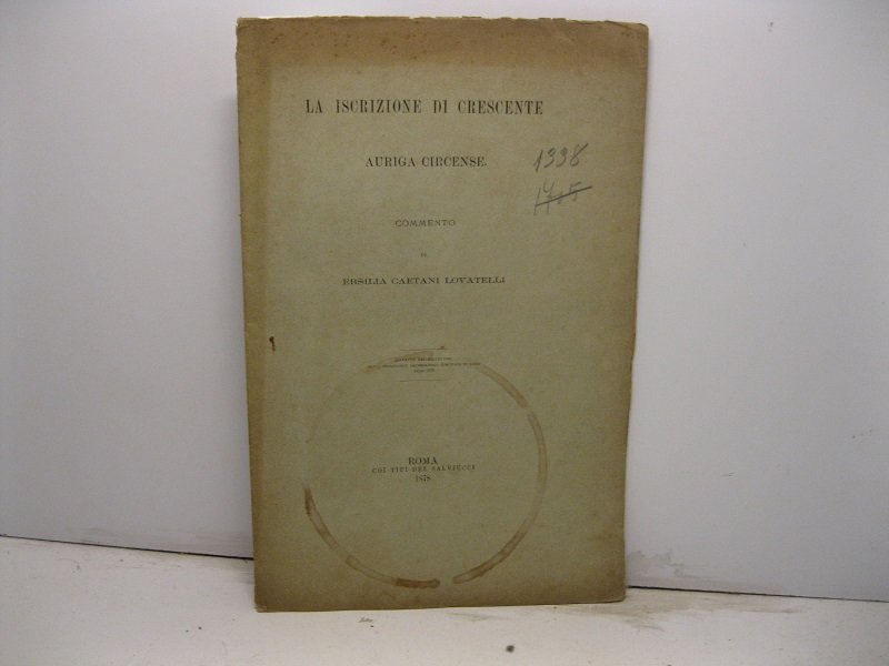 In 8, pp. 15 + (1b) con 1 tav. f.t. Dedica autogr. dell'A. al fr. Alone circolare al p. ant. Br. ed. Descrizione di un'iscrizione che fa riferimento ad un auriga di nome Crescente, ritrovata lungo via della Pace a Roma.
