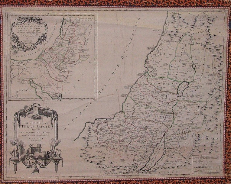 Carta geografica di cm. 53 x 68, confini colorati. Pregevole cartiglio in basso a sinistra. Grande riquadro in alto a sinistra, con cartiglio, raffigurante : Carte de la Terre de Canaan ou Terre Promise . Bacchette in legno al marg. sup. ed inf.