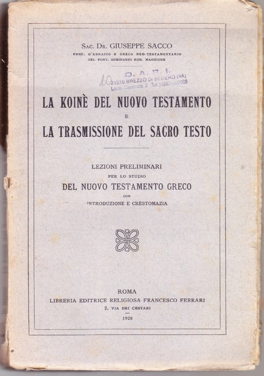 La koiné del Nuovo Testamento e la trasmissione del sacro testo. Lezioni preliminari per lo studio del Nuovo Testamento greco con introduzione e crestomazia