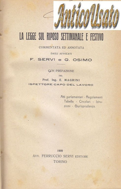 LA LEGGE SUL RIPOSO SETTIMANALE E FESTIVO di Servi e Osimo 1909 Libro