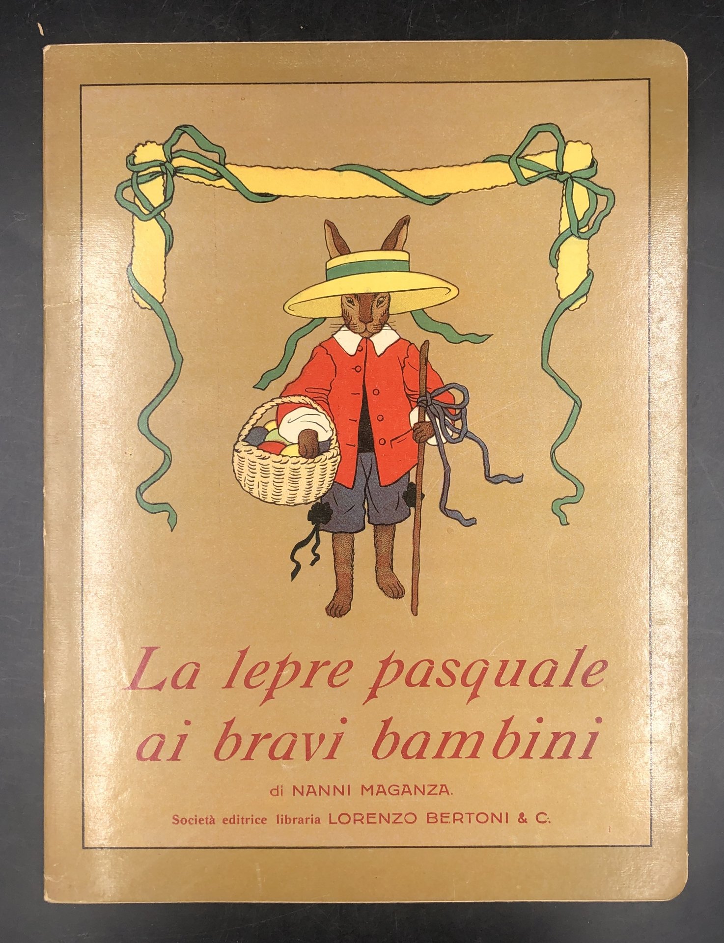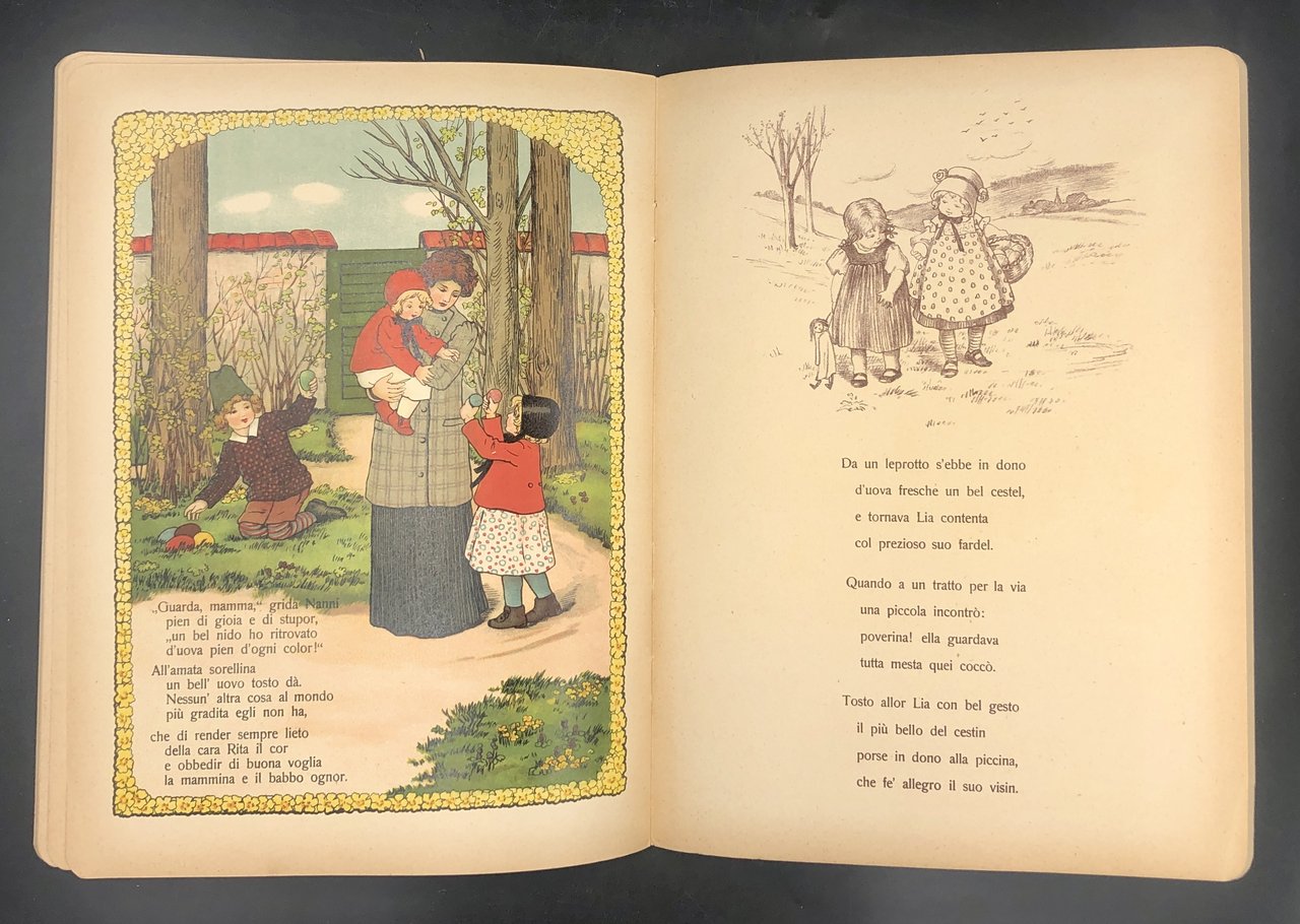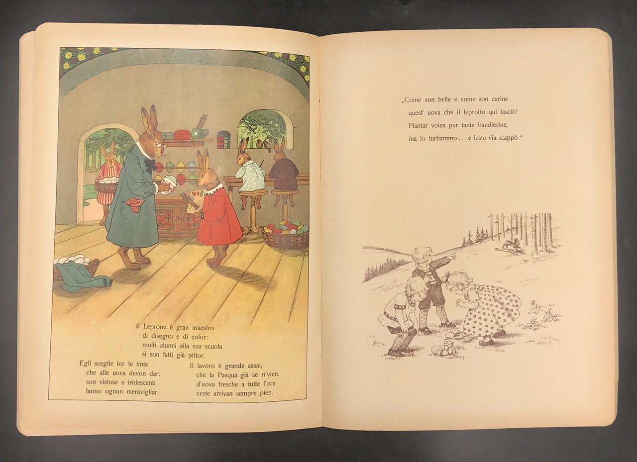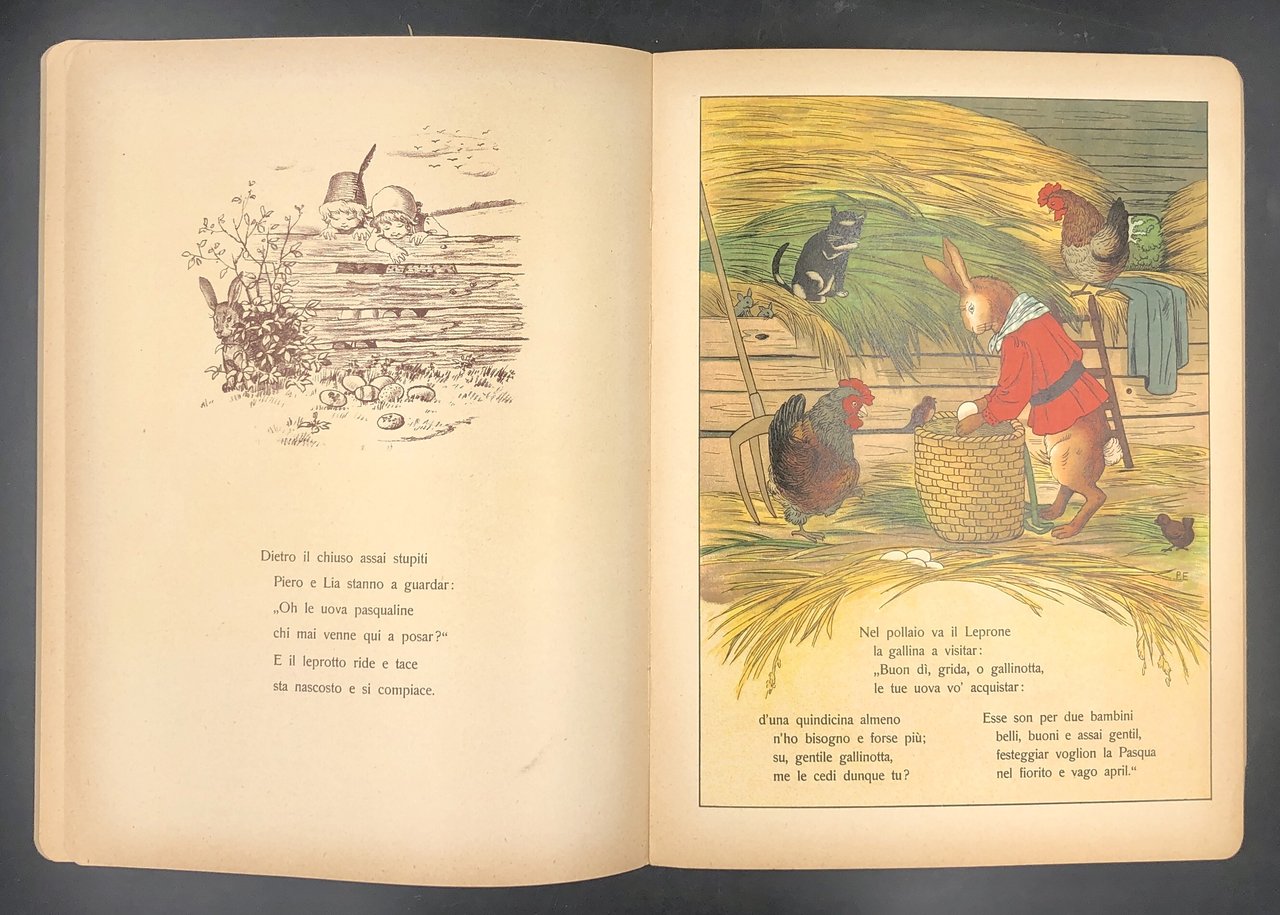 In-4° (cm. 29 x 22), pp. (12), ciascuna con 6 TAVOLE a COLORI in LITOGRAFIA a piena pagina a fronte del testo e 6 ILLUSTRAZIONI monocrome in marron (bistro) al verso. Cartonatura editoriale con illustrata in CROMOLITOGRAFIA al piatto anteriore. Delizioso album per l'infanzia, legato alla tradizione germanica dell' "Osterhasen", in cui la famiglia di leprotti prepara e dipinge le uova di Pasqua da regalare in un canestro ai bimbi che le attendono. Le belle tavole sono siglate "P. E.". Esemplare smagliante.