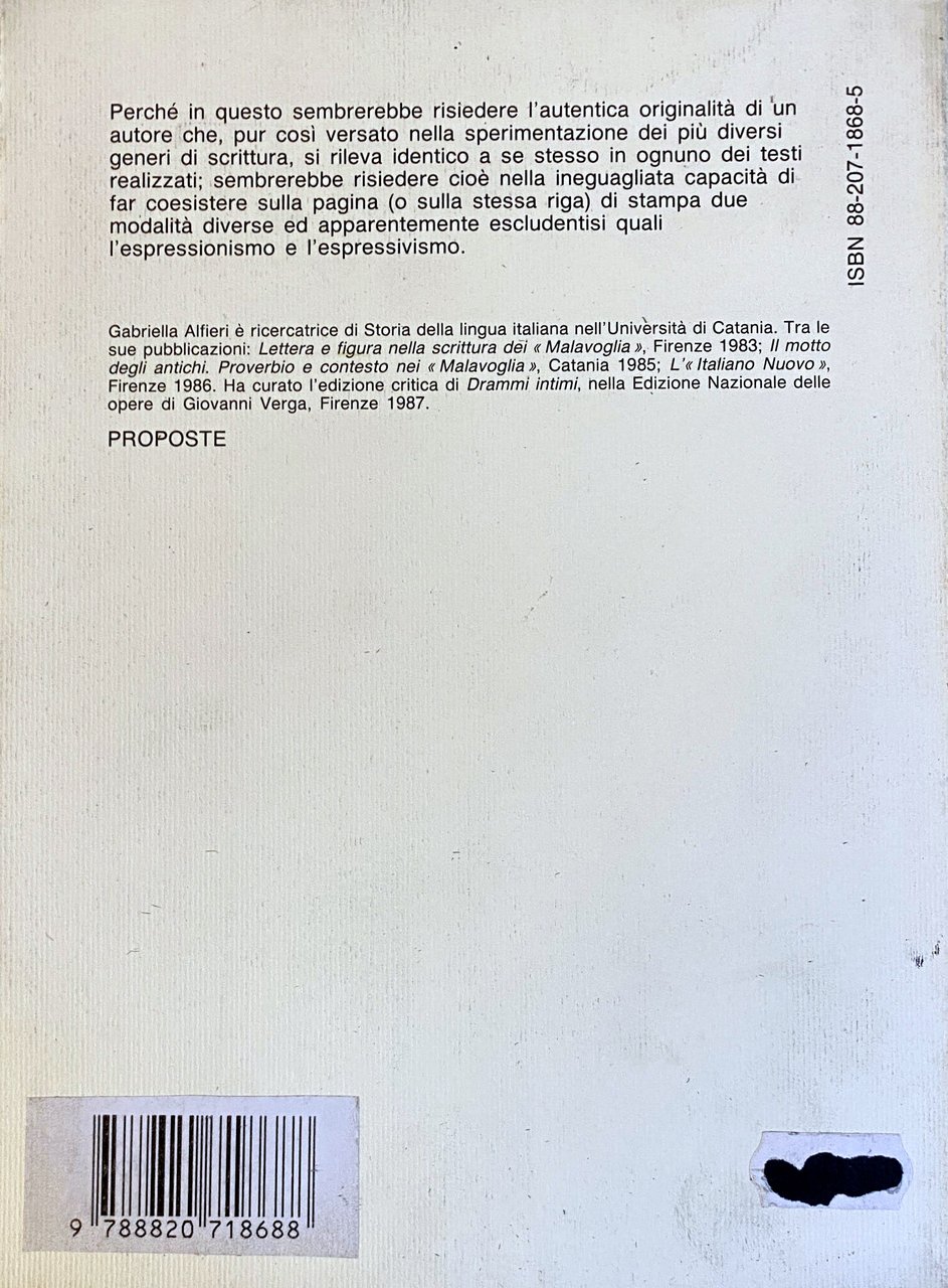 Soggetti: Scrittura Espressionismo Espressivismo Storia Lingua italiana Italianistica Letteratura Critica letteraria Linguistica Lettera Figura Malavoglia Italiano Nuovo Sconciata Alessandro Manzoni Vittorio Imbriani Aperture espressivistiche Effetto comico Ghiribizzi Espressionismi lessicali Lessico comune Tecnicismi Latinismi Forestierismi Regionalismi Cultismi Neoformazioni Sinonimia Variatio Anafora Sintagmatici Idiomaticità Semantica Calembours Rimotivazione metaforica Sintattici Sintassi Stilistici Stile Citazioni Disgressività Parafrasi didascalizzati Favole Studi letterari Bizzarrie satiriche Satira Ironia Racconti Intertestualità Sincronie Antiscrittura Forma comica Macheronico Sconciatura stilistica Etnografazione Etnografata Scapigliatura Linguista Linguaiolo Giochi linguistici Scelta provocatoria Anti-purismo Miscuglio Dialetti Grecismi Generi Purismo toscanista Toscano fiorentino Provocatorio Linguaggio mescidato Vocaboli Locuzioni Grammatica Infrazione Leggere Eudossia conseguita Frasi idiomatiche Composti Fiorentinista Convenzione Filologia Retorica Crusca Convenzioni Scrittori italiani XIX Napoli Fiabe Riviste Hegeliani Risorgimento Ottocento Novecento Bibliografia Riferimento Libri rari fuori catalogo Collezionismo Benedetto Croce Gianfranco Contini Antonio Palermo Esposito Francesco De Sanctis Pacchiano Paradosso Lettere inedite Serianni Giammattei Estetica Morale Religione Pensiero Romanzi Prose Accademici furori Lezioni G. Riso Alimena Ritratti Bertrando Spaventa Carlo Emilio Gadda Canti popolari Merope Carteggio Mastr'Impicca Fanta-Ghirò Erudizione Intellettuali L'impietratrice Aretino La bella bionda Dio ne scampi dagli Orsenigo Carlo Maria Tallarigo Crestomazia Dante Felice Tocco Teoria della macchia Pittura Fame usurpate Saggi critici Novelle Novellaja Conti pomiglianesi Tommaseo Pruderie toscaneggiante Gallicismi Appunti Giovan Battista Basile Romanzo ironico Parodia Verismo Writing Expressionism Expressivism History New Italian language Studies Literature Literary criticism Linguistics Letter Figure Expressivistic openings Comic effect Whimsical Lexical expressionisms Common vocabulary Technical terms Latinisms Foreign Regionalisms Cultisms Neo-formations Synonymy Anaphora Syntagmatics Idiomaticity Metaphorical semantics Syntactics Stylistic syntax Style Quotations Disgressiveness Didactic paraphrases Fables Satirical oddities Satire Irony Intertextuality Synchronies Anti-writing Macaronic Sprawl Ethnographism Linguistic games Anti-purism Dialects Grecisms Genres Tuscanist purism Florentine Tuscan Provocative Mixed Expressions Grammar Infraction Reading Achieved Eudoxia Idiomatic phrases Compounds Convention Philology Rhetoric Conventions Writers Italians Naples Fairy Tales Magazines Hegelians Nineteenth Twentieth Century Bibliography Reference Rare Books Out of Print Collecting Paradox Unpublished Letters Aesthetics Thought Novels Academic Furies Portraits Popular Songs Correspondence Erudition Intellectuals Chrestomacy Critical Essays Short Stories Notes Ironic Novel Parody Verism Isella Dossi Desinenza