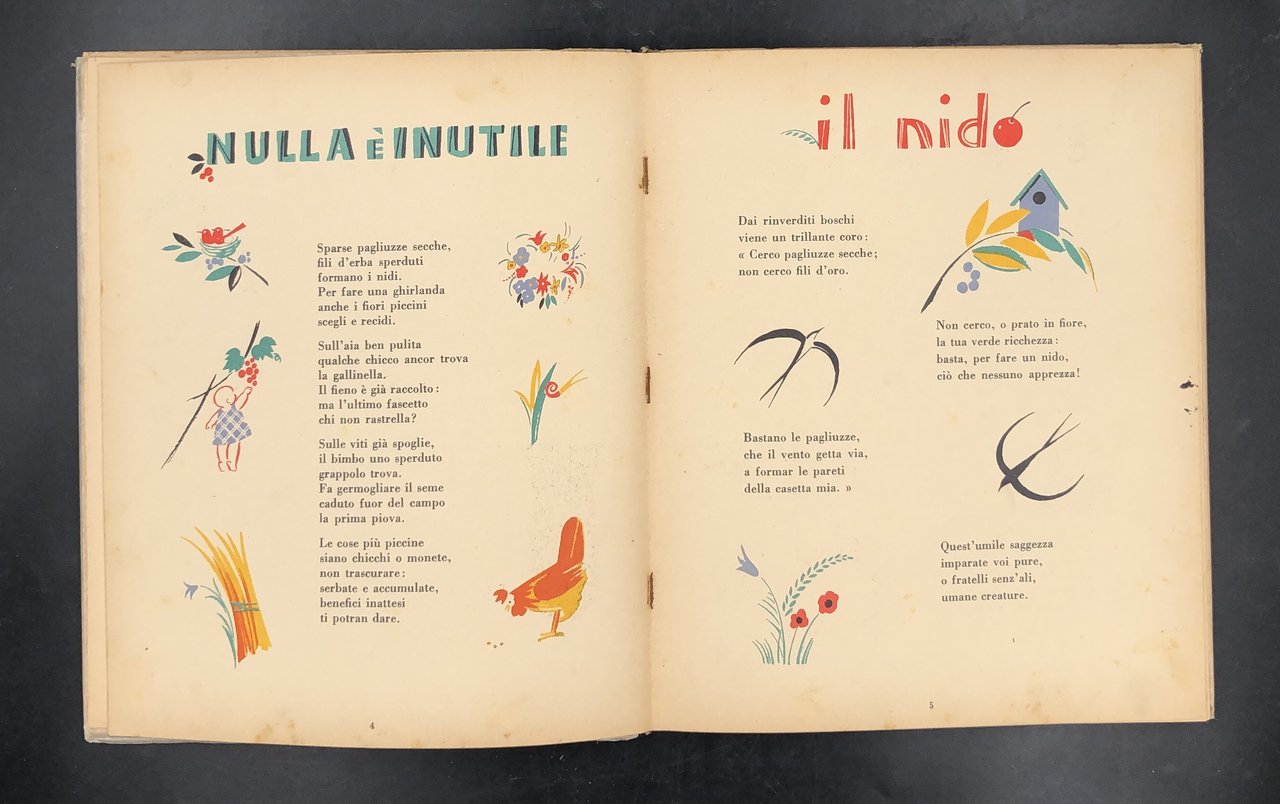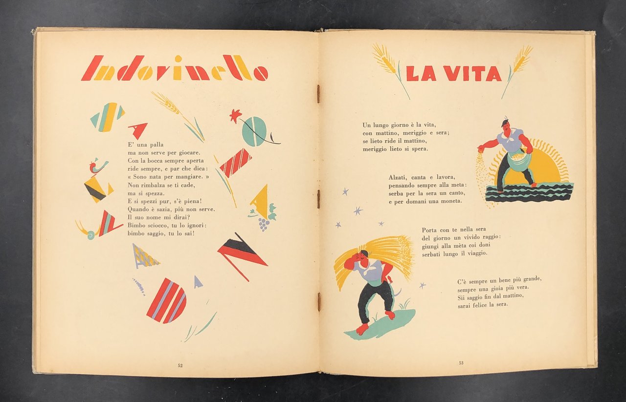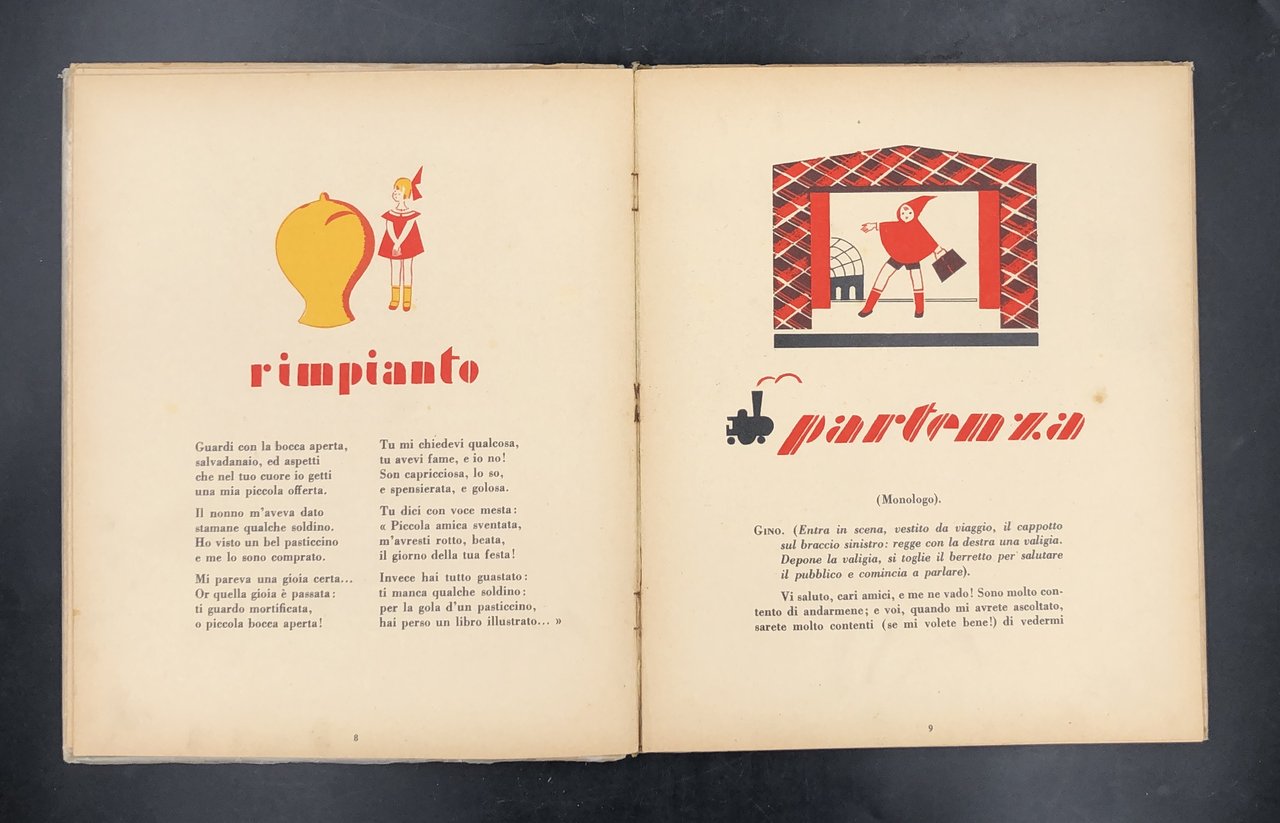 In-8° gr. (cm. 25x20,6), pp. 60, (2) con 84 DISEGNI A VIVI COLORI e belle sguardie ill. di Filiberto MATELDI (Roma 1885-Milano 1942) attore, illustratore, pittore, caricaturista inimitabile nella gaia e geniale capacità di stilizzazione. Cartone ed. ill. a col., variopinto dorso ed. in tela. Deliziose poesiole, prose, monologhi ecc. Ottimo es.ancora nella sua sovraccoperta in velina editoriale Raro esempio di omaggio bancario e di grafica geniale.