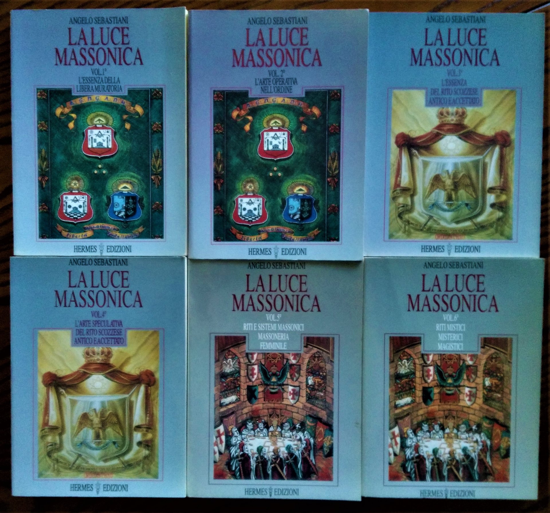 Roma, Hermes, 1992-1995. 8°, sei volumi, brossure editoriali. Vol 1° - L'Essenza della Libera Muratoria, pp. 142. Vol 2° - L'Arte Operativa nell'Ordine, pp. 185. Vol 3° - l' Essenza del Rito Scozzese Antico e Accettato, pp. 140. Vol 4° - L' Arte Speculativa del Rito Scozzese Antico e Accettato, pp. 261. Vol 5° - Riti e sistemi massonici tradizionali. Massoneria femminile, pp. 194. Vol 6° - Riti Mistici, Misterici, Magistici, pp. 226. Belle copie.