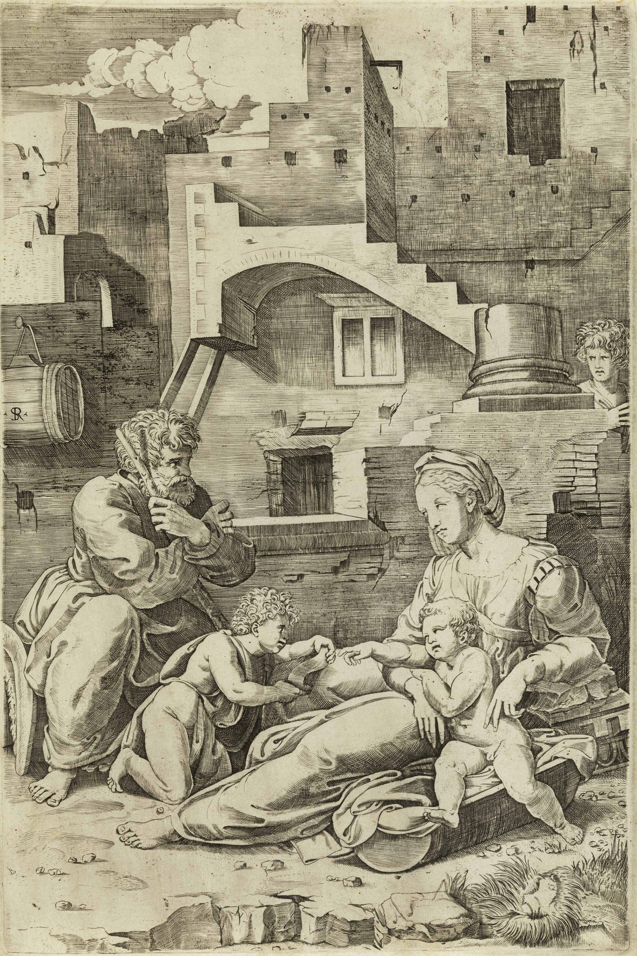>Foglio mm 112x275, inciso a bulino, I stato/III purgato. Impresso su carta con filigrana Ancora nel cerchio con Stella databile fra il 1505 e il 1508. Monogramma "SR" (inciso dentro la botte raffigurata a metà del lato sinistro), che il Vasari disse essere "il segno di Raffaello", adottato dal Dente come proprio. Il soggetto è da mettersi in relazione con i disegni eseguiti da Raffaello sul tema della Sacra Famiglia, dove Dente se ne rivela vivace e dinamico interprete, di contro a un irrigidito Marcantonio, anch'egli esecutore del soggetto. In questa incisione di grande formato la Vergine è ritratta in una posa inusuale, con una gamba piegata ed una stesa, attorniata da Giusppe, il Bambino e Giovannino; sullo sfondo una costruzione con scale, dalla prospettiva architettonica inusuale per l'epoca. Bell'esemplare, il foglio completo della battuta su 3 lati.