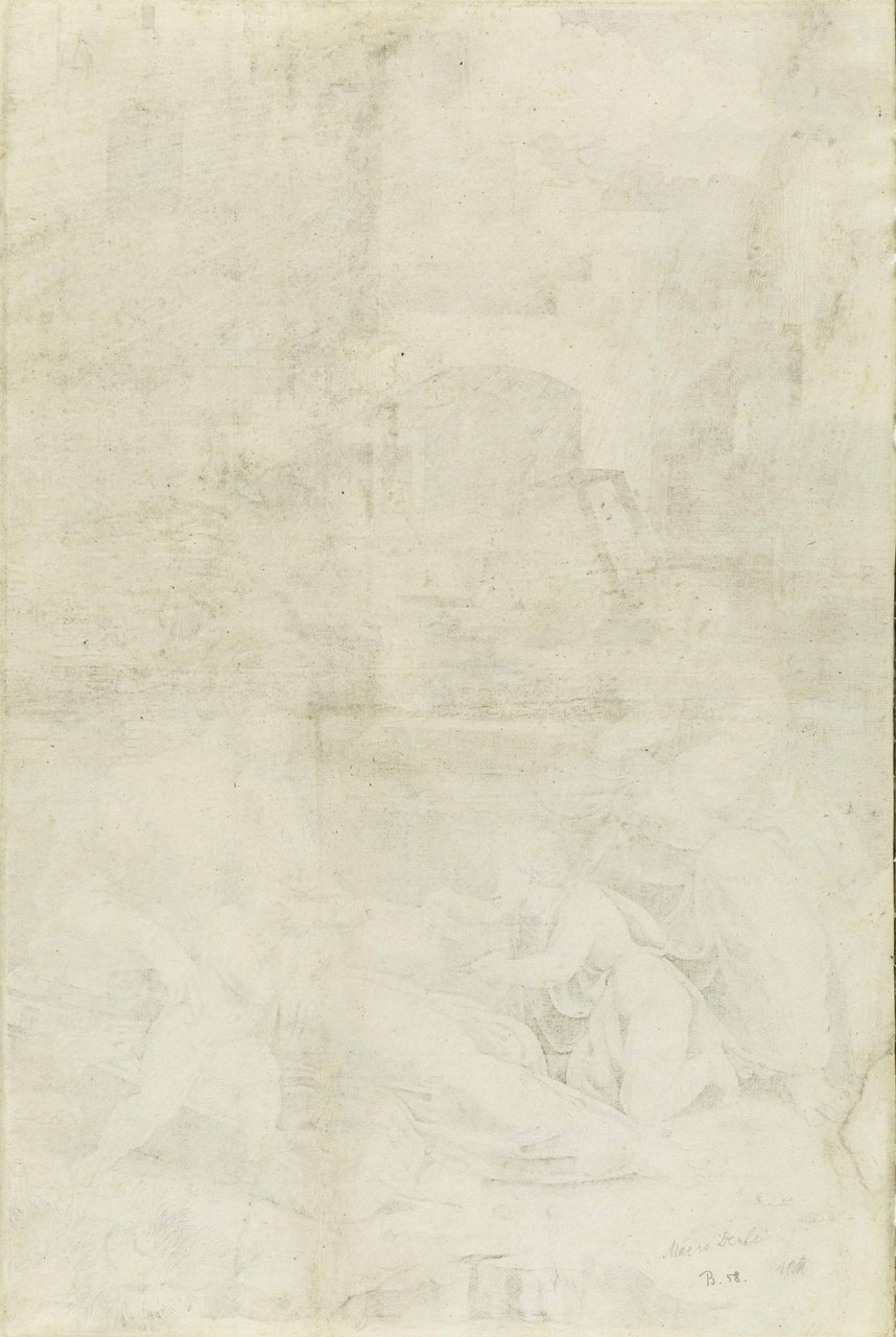 Marco Dente, originario di Ravenna e attivo a Roma nella cerchia di Marcantonio Raimondi. Fu incisore di fiducia di Raffaello a partire dal 1515 circa e morì a Roma durante il sacco del 1527. Fu un virtuoso del bulino, ricordato negli scritti di Giovan Francesco Doni (1549) e di Giorgio Vasari (1550 e 1568), secondo il quale è l'unico degno di essere menzionato tra gli "infiniti" che operarono nella scia del Marcantonio. Bartsch, n. 58; Massari, pp. 207-XXXVIII; Bertelà, n. 179; Briquet, n. 489; Filigrana: Massari, n. 230; Imolesi Pozzi, Marco Dente. Un incisore ravennate nel segno di Raffaello. Le stampe delle Raccolte Piancastelli.