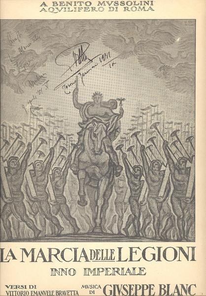 FASCICOLO IN FOLIO, pp.4. COPERTINA EDITORIALE ILLUSTRATA in b/n. CON TITOLO. MARCIA DEDICATA A BENITO MUSSOLINI AQUILIFERO DI ROMA . VERSI DI VITTORIO EMANUELE BRAVETTA, MUSICA DI GIUSEPPE BLANC. IL TESTO DELL'INNO, E' NEL PRIMO RISGUARDO.<BR>OTTIMA CONSERVAZIONE. ID, 5516