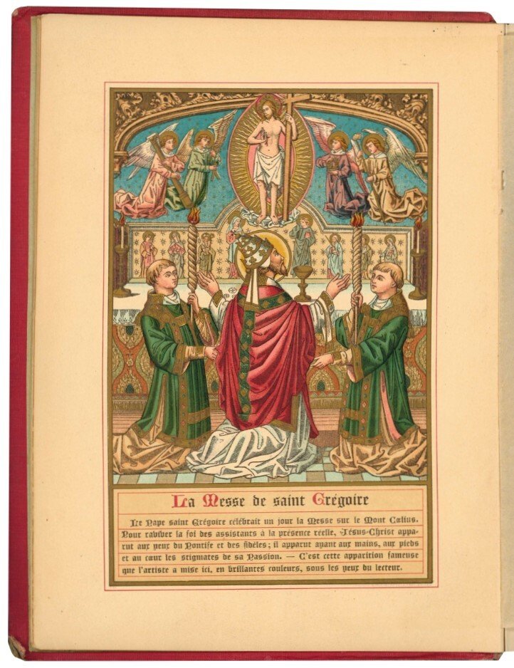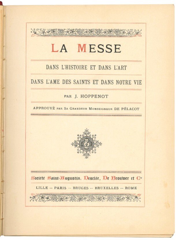 Mm. 318x238. Pp. XII, 385, [3]. Con una litografia a colori in antiporta, protetta da velina trasparente. Opera ricca di illustrazioni nel testo e piena pagina, con tavole in b/n e alcune cromolitografie, testo entro finissimo filetto rosso. Rilegatura in tela rossa illustrata con titolo in blu al dorso e al piatto anteriore, tagli in oro (mancanze alle cerniere). Prima ed unica edizione di questa interessante ed esauriente monografia storico-artistica sulla messa e la sua esecuzione, la sua influenza sociale e politica, la sua storia e i suoi miracoli.