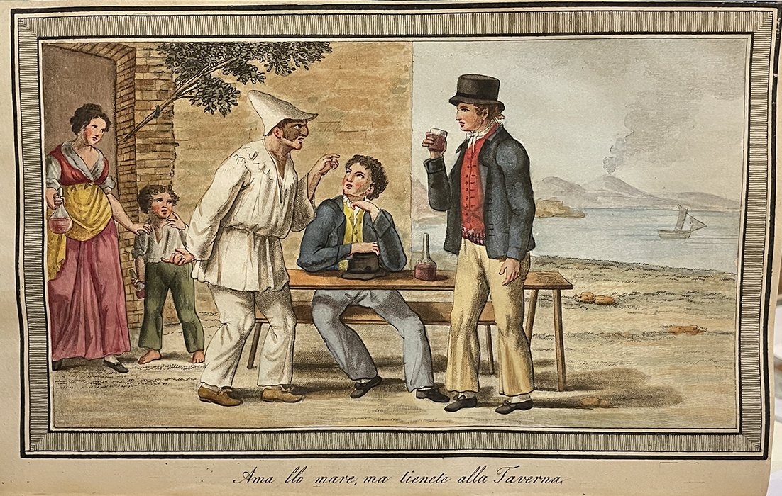 Napoli, Stamp. del Fibreno, 1832. In-4°, leg. m. pelle con tit. in oro, dorso restaurato; pp. XXXVI-38 con 21 tavole f.t., le prime 16 disegnate da Gaetano Gigante (1770-1840), padre di Giacinto, finemente colorate a mano d’epoca, raffig. belle scene di vita quotidiana del popolo napoletano ed hanno per didascalia antichi proverbi e modi di dire popolari, le altre cinque tavole raffig. personaggi dell’antica Grecia, e trenta figure con gesti delle mani ed espressioni del viso nei vari significativi movimenti. Esemplare  con piccoli margini. Edizione originale.
