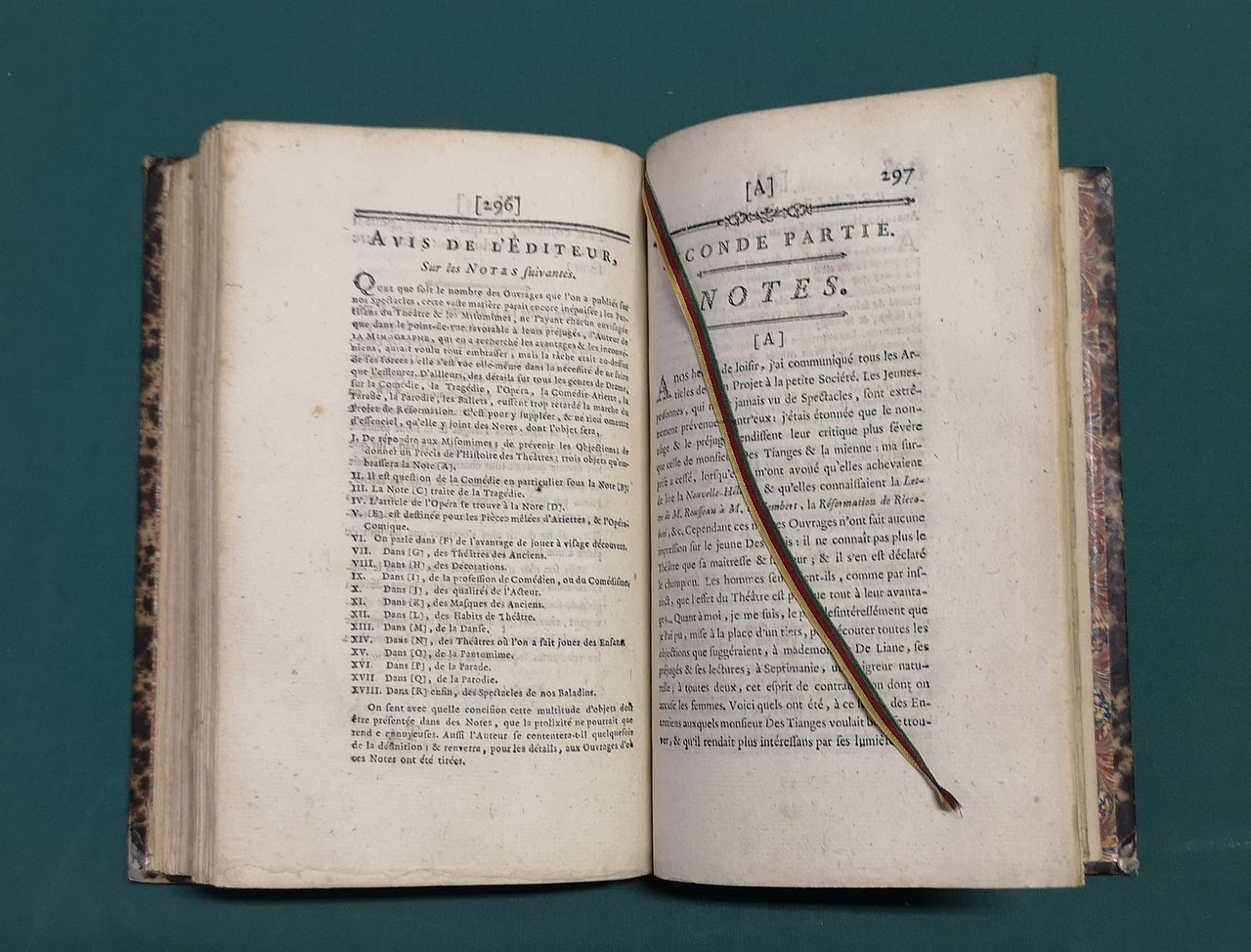>2 parti in un vol. in-8, pp. 466, leg. ottoc. m. pelle, dorso a nervi con tit. oro, taglio super. dor. Prima edizione , assai rara, di questo colto, interessante, ed in certa misura stravagante, trattato in favore della riforma del teatro, argomento assai dibattuto all'epoca. Nella prima parte l'autore (noto letterato, romanziere ed autore drammatico francese, 1734-1806), che in quest'opera dimostra di possedere profonda conoscenza dell'argomento, citando, tra l'altro, Riccoboni e Rousseau, enuncia le proprie idee riformatrici mediante una serie di lettere che si scambiano due sorelle attrici (Madame d'Alzan e Madame Des Tinges); nella seconda, intitolata ''Notes'', e che abbraccia le pp. 297-457, espone più direttamente le varie innovazioni che coinvolgono ogni aspetto e forma di spettacolo : utilità, legittimità e vantaggi del teatro, modifiche della sala (parterre, anfiteatro, logge), vari tipi di rappresentazione (comédie, tragédie, opéra-comique, comédie-ariette, parodie, pantomime), educazione degli attori, abiti, ruoli, direzione, danza, prezzi, ecc. Sostanzialmente, come avverte subito l'editore, ''l'auteur, plus sévère de Riccoboni, voit le Théâtre des mêmes yeux que le célèbre & vertueux Citoyen de Genève: mais loin de chercher, comme J.J. Rousseau, à nous priver, parce qu'il peut être dangereux, d'un plaisir qui réunit l'agréable à l'utile, proprose les moyens de l'augmenter, en même-temps en suggère pour honester la profession de Comédien''. Raro. Ottimo esemplare. Soleinne, Biblioth. Dramatique, V, n.55. De Courville, Bibliogr. de Riccoboni, n. 690.