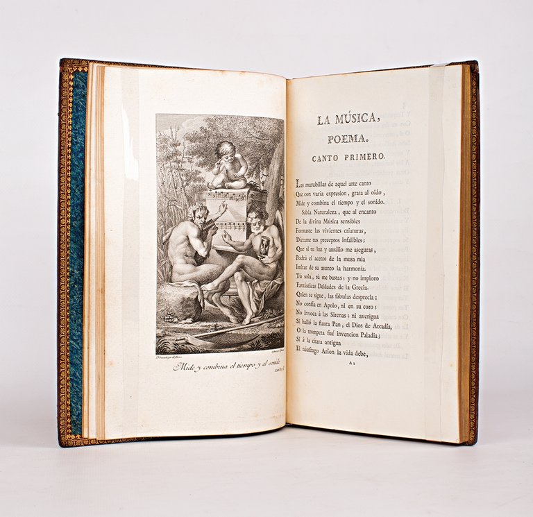 En la imprenta real de la Gazeta | Madrid 1779 | 14.50 x 23 cm | relié | En la imprenta real de la Gazeta, Madrid 1779, in-8 (14.5 x 23 cm), (20 p.) 126ppXL (1 p.), bound Second edition, illustrated with 6 beautiful insert figures printed on cartridge paper signed by G. Ferro, engraved by M.S. Carmona, J. Ballester et F. Selma. Meticulous printing. The first edition is dated 1774, not as well printed as this later edition. A translation was completed in 1799 par Grainville, addressed to the Conservatoire de Musique and approved by Cherubini, Gossec, etc. Contemporary binding in full red morocco signed Derôme le jeune, spine in five compartments richly decorated with grotesque gilt circles and diamond shapes, double gilt fillets and roulettes framing the boards, double gilt fillet highlighting the leading edges, fine gilt lace work tooling framing the paste paper endpapers, all edges gilt. Rubbing on the spine ends, compartments, joints and corners. Tomás de Iriarte (1750-1791) was a renowned poet, fable writer and playwright. La Musica is a didactic poem in which its author explains the rarity of his undertaking in the prologue, including two other attempts, of lower caliber, in the field. The first song defines music by summarising it with two essential principles: sound and time. The second deals with expression. The third song deals with the excellence of music based on its uses. The fourth is about theatre music and the fifth exposes music intended for entertainment and music devoted to solitude. Very beautiful copy. * [FRENCH VERSION FOLLOWS] | Seconde édition, illustrée de 6 belles figures hors-texte imprimées sur papier fort signées de G. Ferro, gravées par M.S. Carmona, J. Ballester et F. Selma. Impression soignée. L'édition originale date de 1774, moins bien imprimée que cette dernière. Une traduction en sera faite en 1799 par Grainville, adressée au conservatoire de musique et approuvée par Cherubini, Gossec. Reliure de l'époque en plein maroquin rouge signée Derôme le jeune, dos à cinq nerfs richement orné à la grotesque de cercles et losanges dorés, doubles filets et roulettes dorées en encadrement des plats, double filet doré soulignant les coupes, fine dentelle dorée en encadrement des contreplats de papier à la colle, toutes tranches dorées. Frottements en coiffes, nerfs, mors et coins. Tomás de Iriarte (1750-1791) fut un poète, fabuliste et dramaturge renommé. La Musica est un poème didactique dans lequel son auteur explique dans le prologue la rareté de son entreprise, comptant deux autres essais dans le domaine, mais de moindre envergure. Le premier chant définit la musique en la résumant à deux principes essentiels : le son et le temps. Le second traite de l'expression. Le troisième chant s'occupe quant à lui de l'excellence de la musique fondée sur ses usages. Le quatrième traite de la musique de théâtre et le cinquième expose la musique destinée aux divertissements et celle vouée à la solitude. Très bel exemplaire.