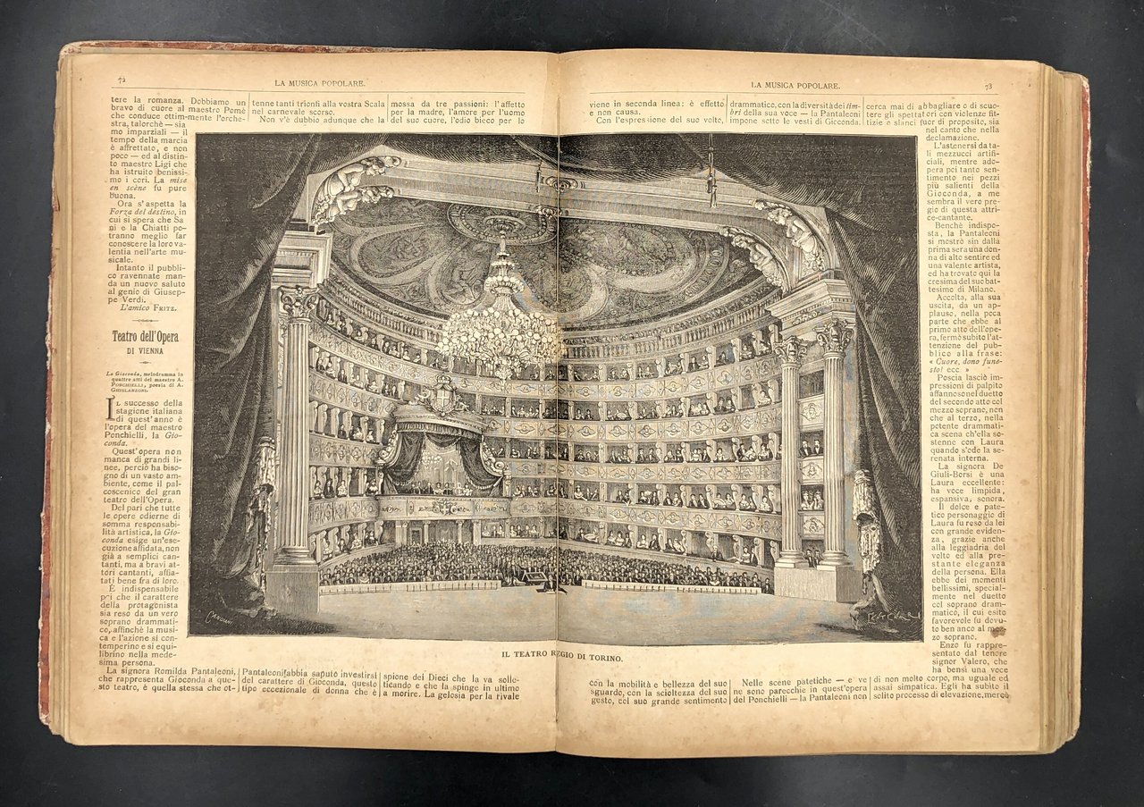 12 fasc. rilegati in un vol. in-4° (cm. 28,2x21), pp. (4, cioè la cop. e il front. annuale) + pp. 192 + 48 pagine di spartiti musicali + 8 pp. (SCRITTURA e STAMPA della MUSICA, numero speciale aggiunto del "Bollettino Bibliografico", n. 6, 1884, con un ritr. e 2 TAVOLE di facsimile in rosso e nero) testo inquadrato da filetti rossi) + (6) pp. di indici. Con 12 bei RITRATTI di artiste/i e cantanti e ill. (tra cui gran veduta dell'interno dello scomparso Teatro Regio di TORINO con tribuna Regale e del teatro Apollo di Roma). Mz. tela coeva, tit. filetti oro ds. Conservate tutte le copertine orig. Biografie di grandi MUSICISTI. Articoli di teoria musicale, teatro, scuole di canto, Opera, strumenti ecc. Rarità.