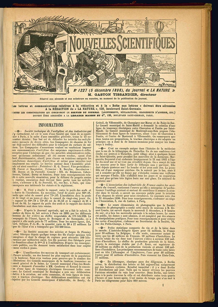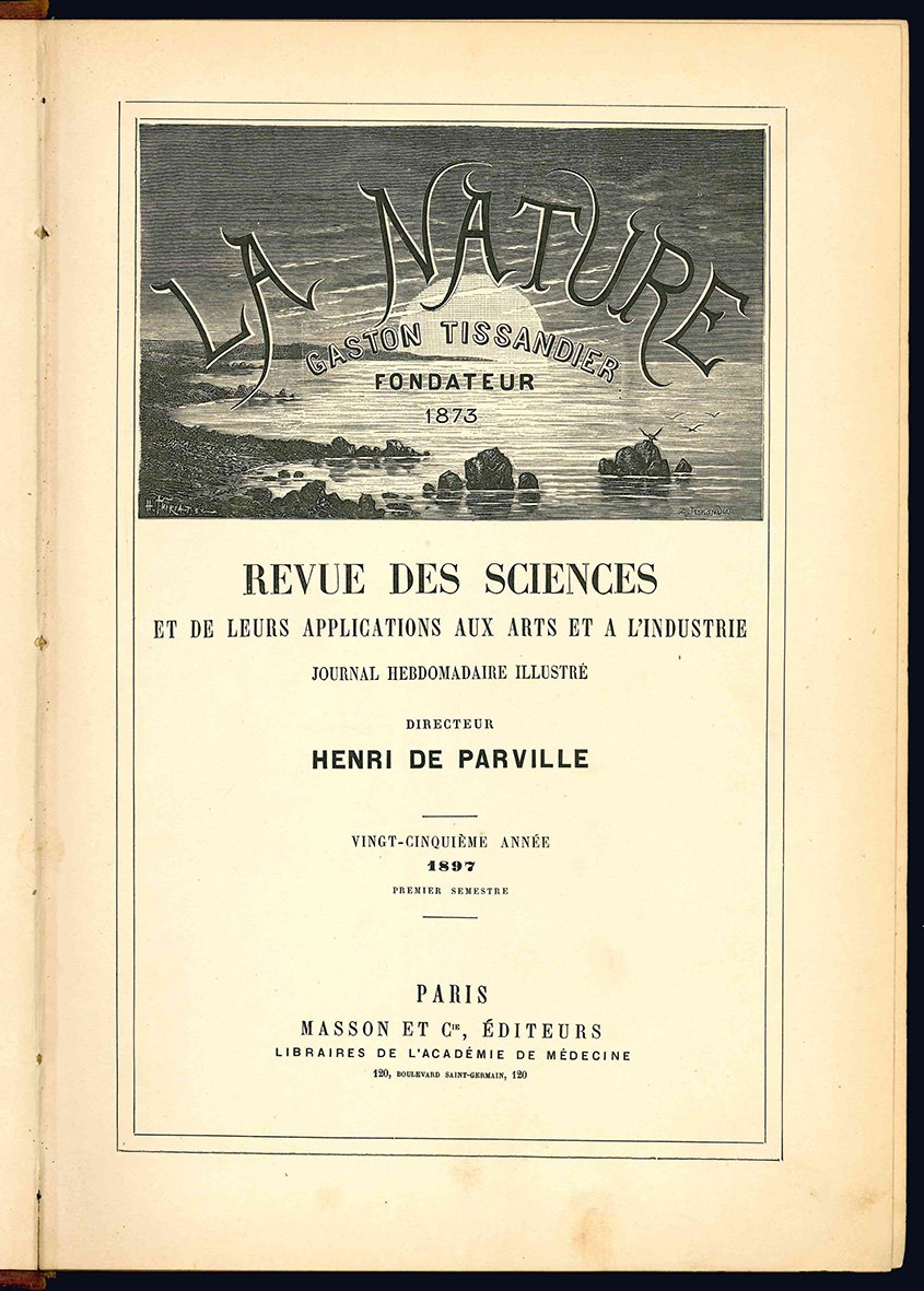 La nature. Revue des sciences et de leurs applications aux arts et a l'industrie. Journal hebdomadaire illustré. Directeur Henri de Parville. Vingt-cinquième année 1897 premier semestre. (Legato con:) Nouvelles Scientifiques (5 décembre 1896 - 29 mai 1897), du journal "La Nature".