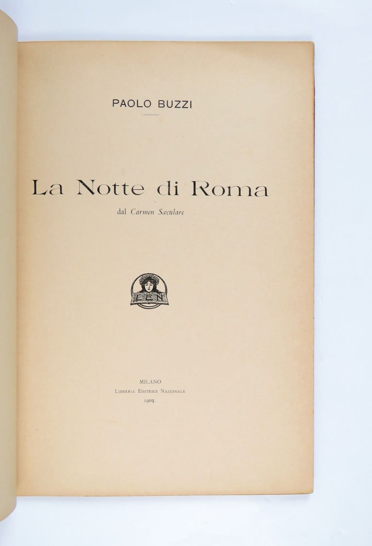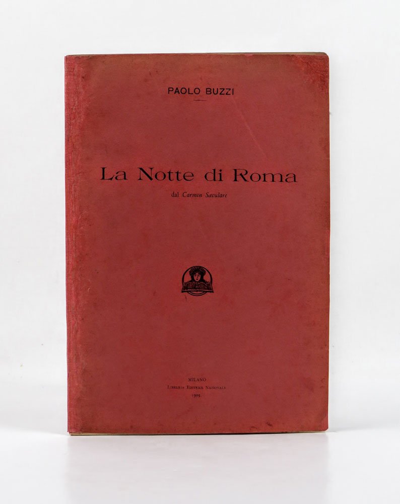 LIBROEdizione originale.Ottimo esemplare (restauro di rinforzo alla cerniera e al sottilissimo dorso muto, eseguito in maniera professionale).Rarissimo estratto «dal “Carme di Vittorio Emanuele” parte dell’opera inedita “Carmen Sæculare”», dedicato «All’amico Avv. Antonio Vismara che celebrando nozze fa atto di poesia || Milano 23 Dicembre 1903». Assieme al «Carme di Re Umberto» (Treves 1901) e al «Il Carme di Napoleone Bonaparte» (P. Agnelli 1901), questo opuscolo è una delle minute testimonianze a stampa del progetto noto come «Carmen sæculare» che Buzzi andò elaborando dalla fine dell’800 per consegnarlo alle stampe solo nel 1919-20 come «Poema di Garibaldi» e «Carmi degli Augusti e dei Consolari» («La Notte di Roma» fu qui ripubblicata con varianti alle pp. 121-finis del «Notturno di Re Vittorio Emanuele il Grande»).Rampazzo, «Paolo Buzzi tra Gabriele D’Annunzio e Giuseppe Garibaldi» (Riv. Lett. Ital. XXVII,3, 2009), p. 206 nota 9