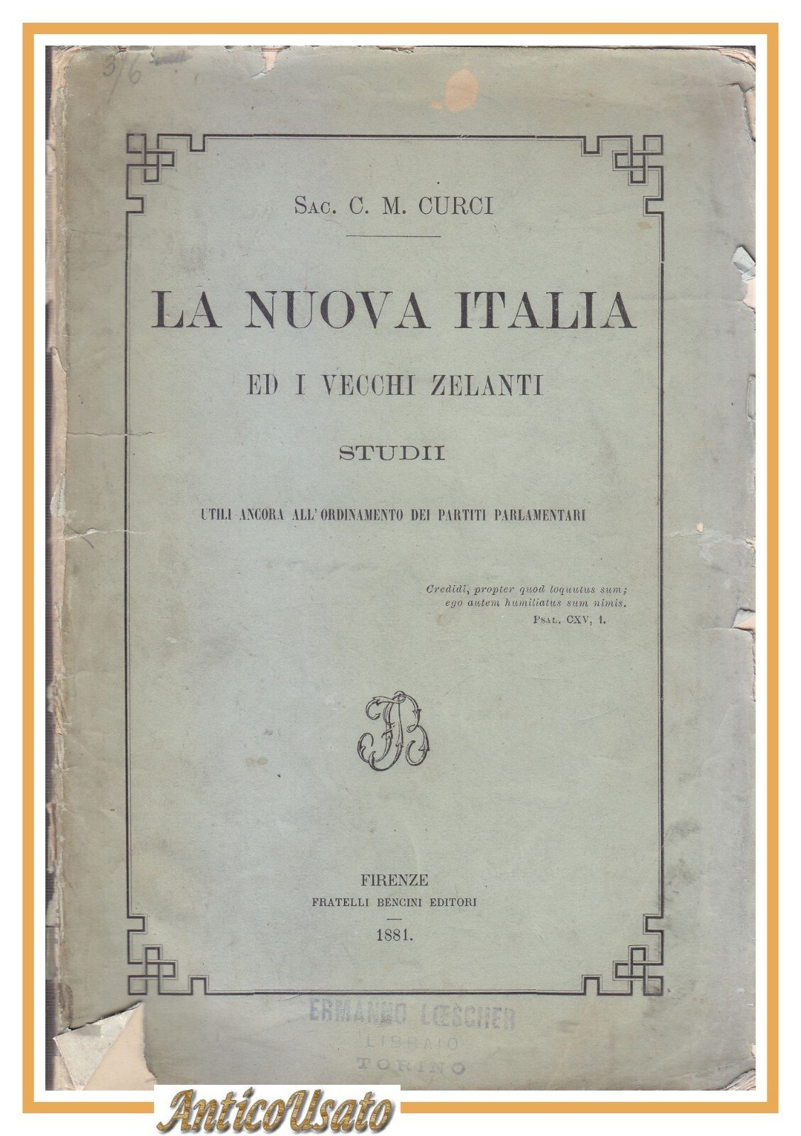 LA NUOVA ITALIA ED I VECCHI ZELANTI studii utili ancora all'ordinamento dei partiti parlamentari di Sac. C. M. Curci.