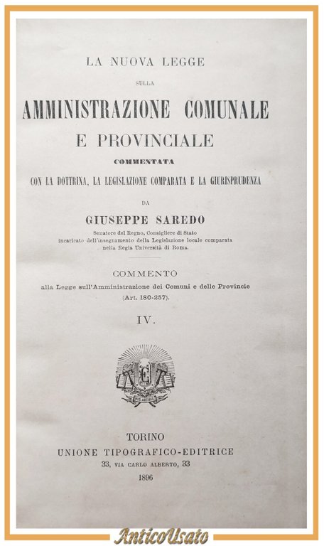 LA NUOVA LEGGE AMMINISTRAZIONE COMUNALE E PROVINCIALE volume 4 Saredo 1896 Libro