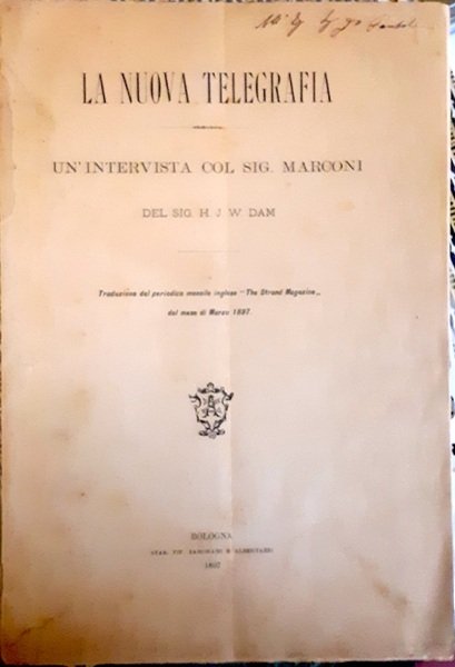 Pp. 16, cm. 27,5 x 19, paper editorial cover, with staples. A photographic portrait of Marconi at p. 8.The first Italian edition, and the first in an independent printing of the first interview with Marconi made by the English press: the article was publicated in United Kingdom, by the “The Strand Magazine” (in UK, 13, pp. 273-80). Author of the interview was Henry Jackson Dam, a member of the Royal Institution of London, and a journalist and inventor as well (in the same year we know he obtained a patent for a “high-explosive projectile”). At the time of this interview Marconi was only 22 years old (even if, according to Dam, he looked “at least thirty”), and living in London: his first succesful experiment of wireless transmission with electromagnetic waves was done two years before, but the first paper in which the results of his experiment were described by himself and under his signature would have been published only in 1899, i.e. two years later. On higher plate there’s a handwritten note of sending, probably by Marconi himself.This can be considered the first interview to Marconi ever published in Italy, with the exception of a very short article appeared in “La Tribuna”, a newspaper of Rome, in December the 23rd of 1896 (but the interview, gathered by Olindo Malagodi, is much synthetic and couldn’t have been the subject of a publication in a volume): it’s only in the interview released to Dam that Marconi reveals some details about his early and late experiments.There are traces of two copies only in Italy (Bologna, Museo Marconi and Florence, Biblioteca nazionale). Questo è il primo libro mai scritto sulle ricerche di Marconi. Prima edizione italiana e la prima in volumetto a sé della prima intervista fatta a Guglielmo Marconi da un giornalista straniero: l’articolo fu pubblicato nel Regno Unito dallo “Strand Magazine”. Autore è Henry Jackson Dam, membro della Royal Institution di Londra, giornalista e lui stesso inventore (nello stesso anno otteneva il brevetto per un “proiettile altamente esplosivo”). All’epoca dell’intervista Marconi era solo ventiduenne e viveva a Londra: il suo primo esperimento riuscito di teletrasmissione era avvenuto due anni prima, ma il primo articolo di suo pugno in cui si descrivevano i suoi esperimenti sarebbe uscito solo nel ’99, cioè due anni dopo di quest’intervista, che può essere considerata la prima significativa esposizione degli esperimenti marconiani (anche considerato che la traduzione stessa è attribuibile a Marconi). Al piatto superiore c’è una nota d’invio manoscritta, probabilmente dello stesso Marconi. Questa può essere considerata anche la prima intervista a Marconi mai pubblicata in Italia, con l’eccezione di un brevissimo articolo apparso nella “Tribuna” di Roma, a fine 1896 (ma l’intervista, raccolta da Olindo Malagodi, è piuttosto sintetica e di certo non avrebbe potuto essere pubblicata in un pur snello documento come il presente): è solo con l’intervista rilasciata a Dam che Marconi rivela dettagli circa i suoi esperimenti. Solo due copie nelle biblioteche italiane (Bologna, Museo Marconi e Biblioteca Nazionale di Firenze).