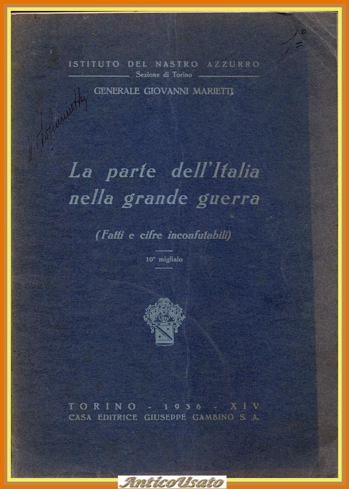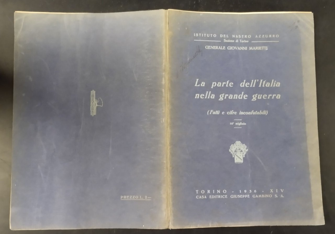 LA PARTE DELL'ITALIA NELLA GRANDE GUERRA (Fatti e cifre inconfutabili) di Generale Giovanni Marietti. Gambino Editore, 1936 . 64 pagine, fotografie in bianco e nero fuori testo. Copertina editoriale in brossura. Stato di conservazione: buono (pagine normalmente ingiallite, firma di appartenenza, copertina un po' sciupata) Libro usato saggistica fascismo prima guerra mondiale