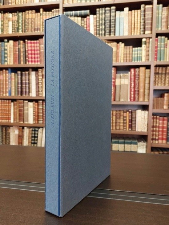 In-4° stretto (cm. 36), pagine non numerate, composte a mano in carattere Caslon. Esemplare numero 39 della tiratura in carta Magnani avorio. A corredo del volume una cartella con 18 tavole policrome del pittore Venturino Venturi. Brossura a risvolti con titolo al piatto, camicia e cofanetto cartonati blu. Edizione uscita in occasione dell'ottantacinquesimo compleanno del poeta, che scrisse questo poema per la Via Crucis celebrata al Colosseo da Giovanni Paolo II. Cfr. Mavilla p. 210. Esemplare allo stato di nuovo.