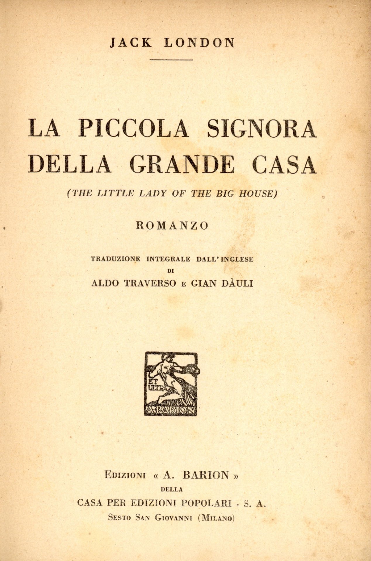 352 p. ; 19 cm. Traduzione Aldro Traverso e Gian Dauli. Legatura editoriale coeva. 813 - Ba Buono (Good)