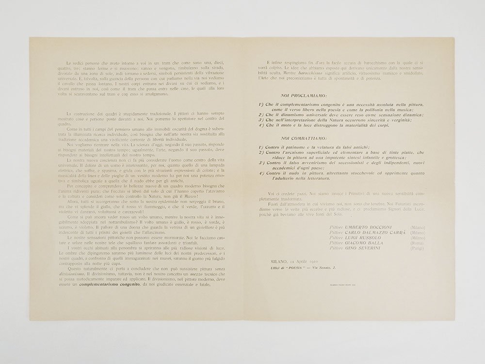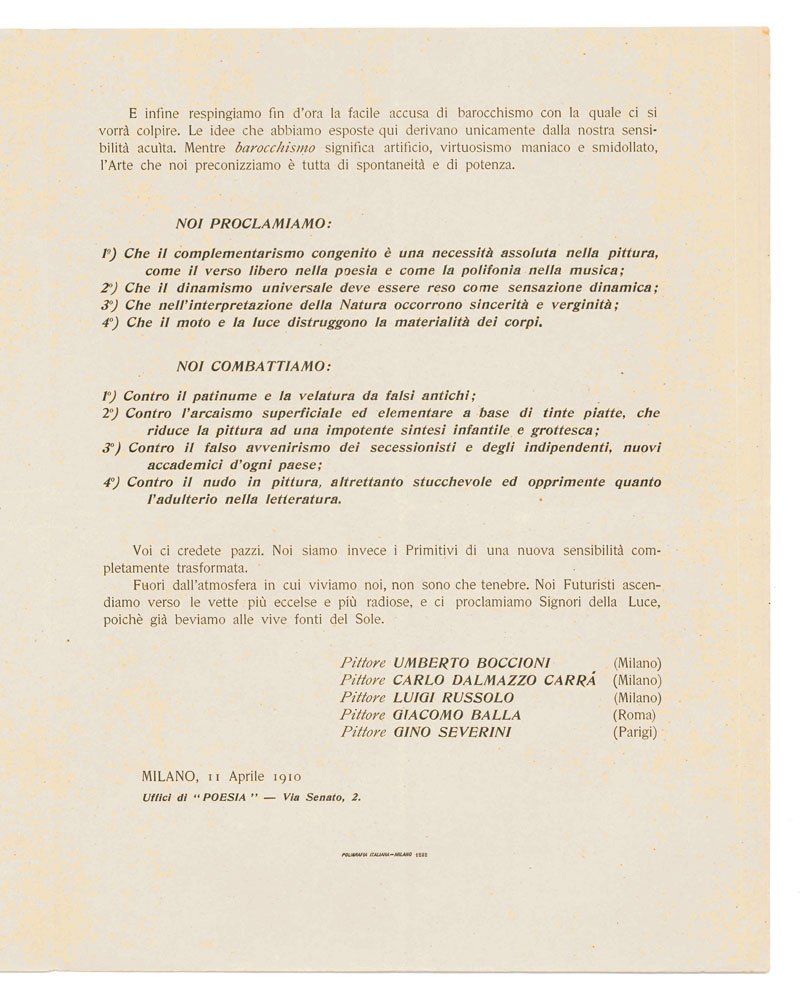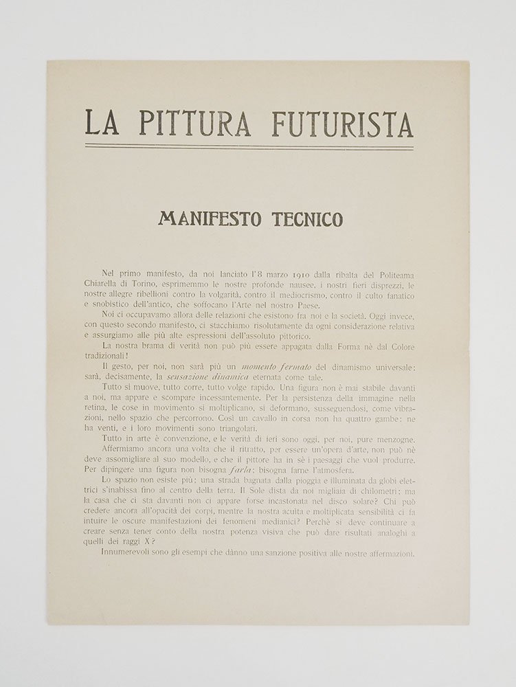 MANIFESTOSeconda edizione modificata ed edizione definitiva.Eccellente esemplare, fresco, pulito e intatto (appena percepibile il segno della piegatura orizzontale, con minima gualcitura in corrispondenza del bordo esterno).Non comune stampa definitiva della prima edizione del «Manifesto tecnico della pittura futurista», il manifesto fondamentale che gettò le basi teoriche del futurismo pittorico. Composto nel mese abbondante che trascorse tra la serata d’esordio dei pittori futuristi l’8 marzo al Teatro Chiarella di Torino, e il 19 aprile (data di un articolo di De Grubicy sul «Secolo» che ne accusa ricezione), il manifesto uscì inizialmente con la firma di Aroldo Bonzagni (secondo le ultime ricerche, ne furono effettuate più stampe varianti a breve seguire l’una dall’altra). Qualche tempo dopo, Marinetti fece realizzare una stampa definitiva dove si trova il nome di Giacomo Balla al posto di Bonzagni. Questa nuova stampa contiene anche una non banale variante testuale: laddove a pagina due (quarto paragrafo) le stampe precedenti hanno «corrente scientifica» qui troviamo «corrente di libertà individuale». Inoltre, la pagina del bifolio misura 220 mm in larghezza, contro i 230 usuali dei manifesti futuristi (che è la misura anche della prima tiratura). -- «As events unfolded, Aroldo Bonzagni left the group, Giacomo Balla entered the fold, and a fourth printing of the technical manifesto was undertaken, featuring the signatures of the definitive quintet of Futurist painters. The text of this new leaflet was entirely recomposed, using a similar but different font, with small adjustments and only one significant change: in the paragraph where the Futurist painters draw a parallel between the “enlightened individual research [that] has taken the place of […] dogma in all fields of human thought” and the “vivifying current of individual freedom” that should “replace academic tradition” in art, the earlier printings have “vivifying scientific current”, whereas the definitive printing uses the phrase “vivifying current of individual freedom”. When exactly the last and definitive printing of the “Manifesto tecnico della pittura futurista” took place, will probably remain an unsolved question. The documents [.] suggest that it was not done before September 1910, i. e. four months after the announcement of Giacomo Balla’s entry into the group of Futurist painters. It may well be that this version was only printed and distributed together with the other propaganda material that Marinetti had lined up in great quantities to prepare the Italian public for the second season of Futurist serate in 1911» (Coronelli). -- Questa nuova edizione, presentata come formalmente identica alla princeps, fissò il testo definitivo del manifesto che dal. 1913 in poi verrà ristampato in dépliant sotto l’egida della Direzione del Movimento futurista e ripreso nelle varie antologie d’epoca e nel libro di Boccioni sul «Dinamismo plastico».Bibl. Coronelli, The Futurist Manifestos of Early 1910 (IYFS 12, 2022: 3-49), pp. 15-18, fig. 3b & Appendix 3 n. 1.4; Tonini, I manifesti del futurismo, n. 9.2 (con imprecisioni); manca completamente a D’Ambrosio, Nuovi archivi del futurismo 2: Manifesti programmatici (2019).